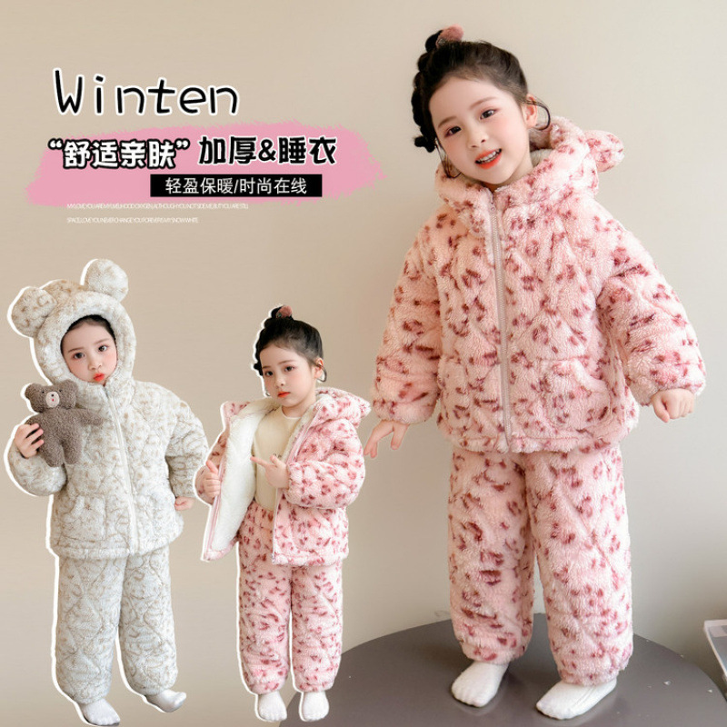 儿童冬季睡衣三层夹棉豹纹连帽套装女童加绒加厚家居服超厚两件套