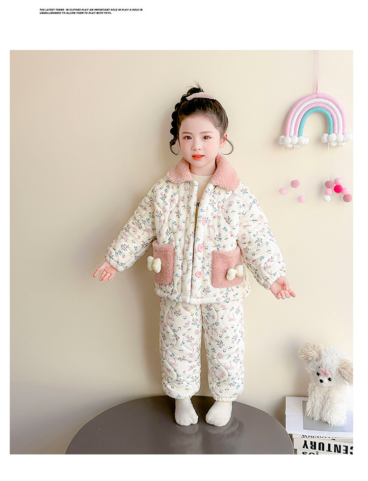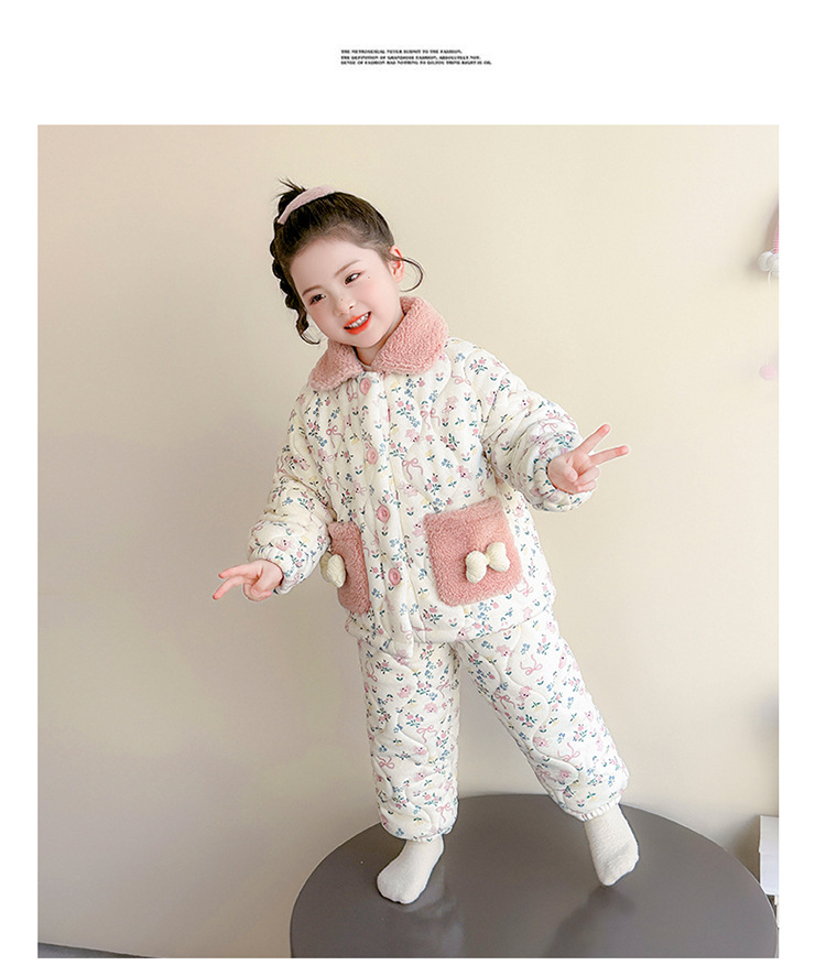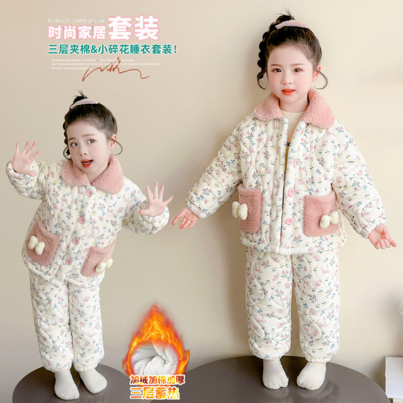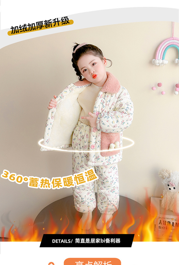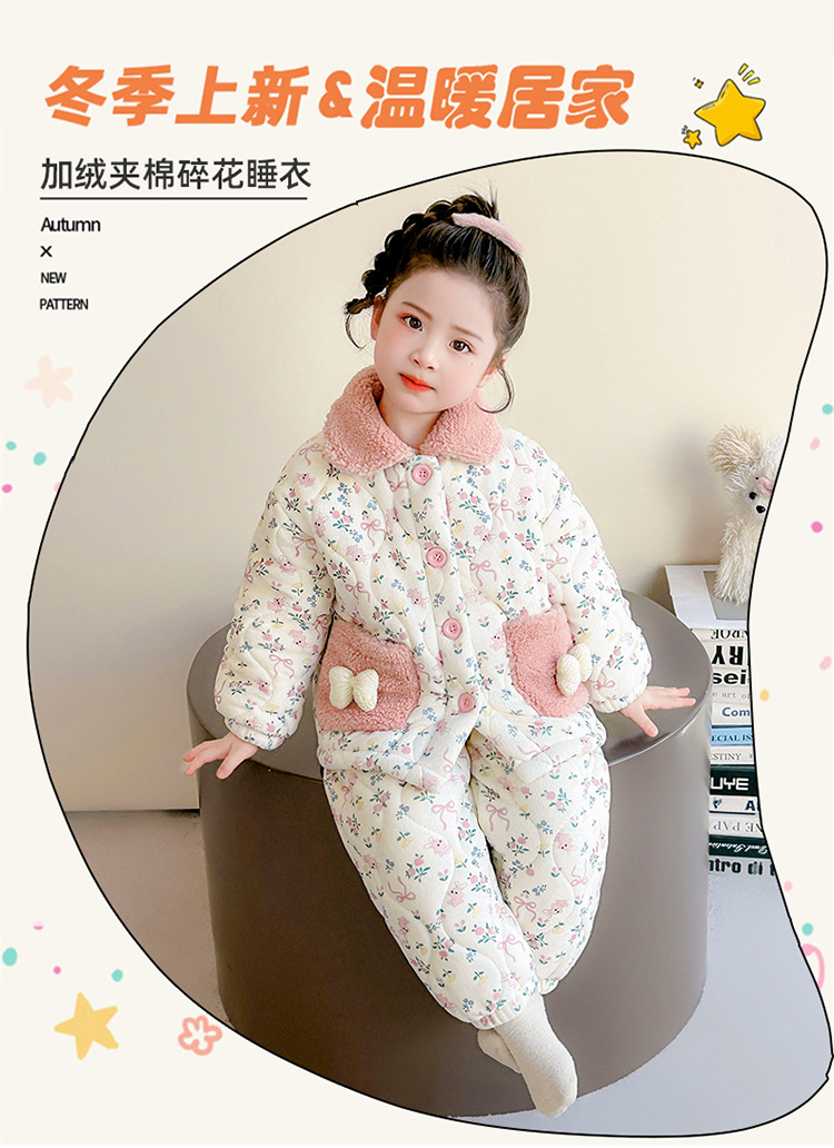 女童卡通碎花法兰绒三层夹棉家居服套装小女孩冬季加绒加厚两件套