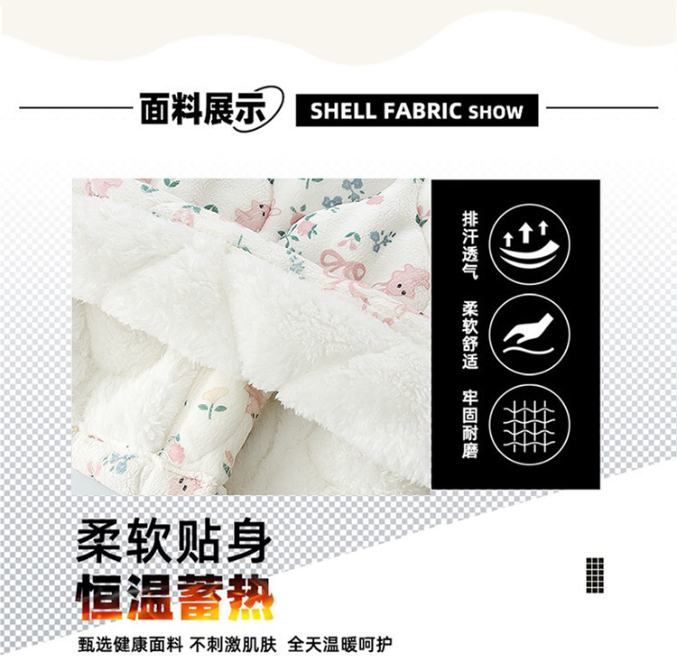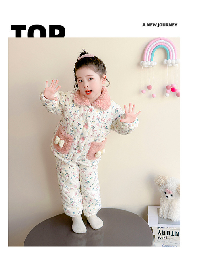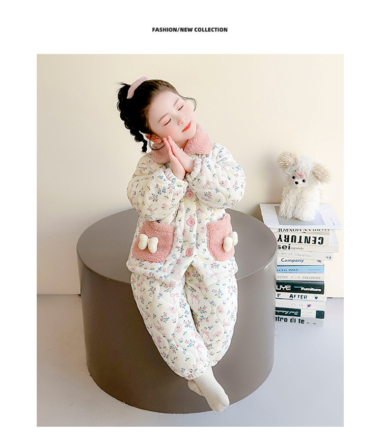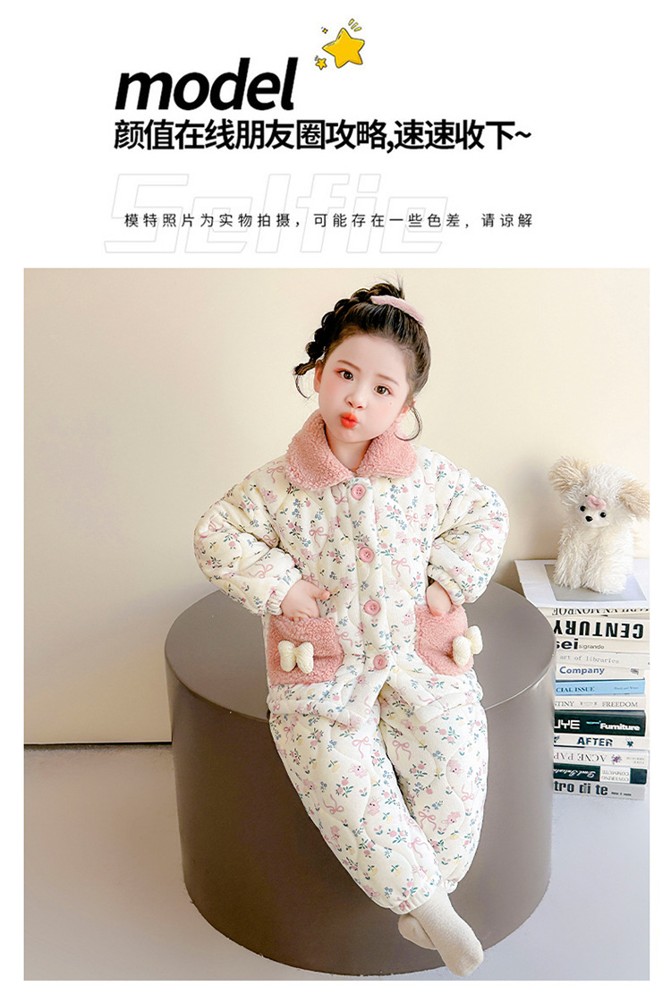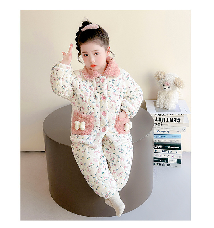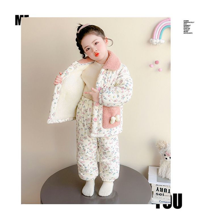 女童卡通碎花法兰绒三层夹棉家居服套装小女孩冬季加绒加厚两件套