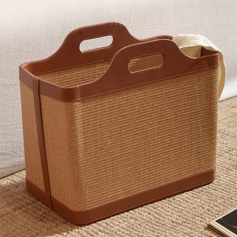 轻奢皮革收纳篮家用客厅储物手工编织置物篮杂物桶带拉手收纳筐