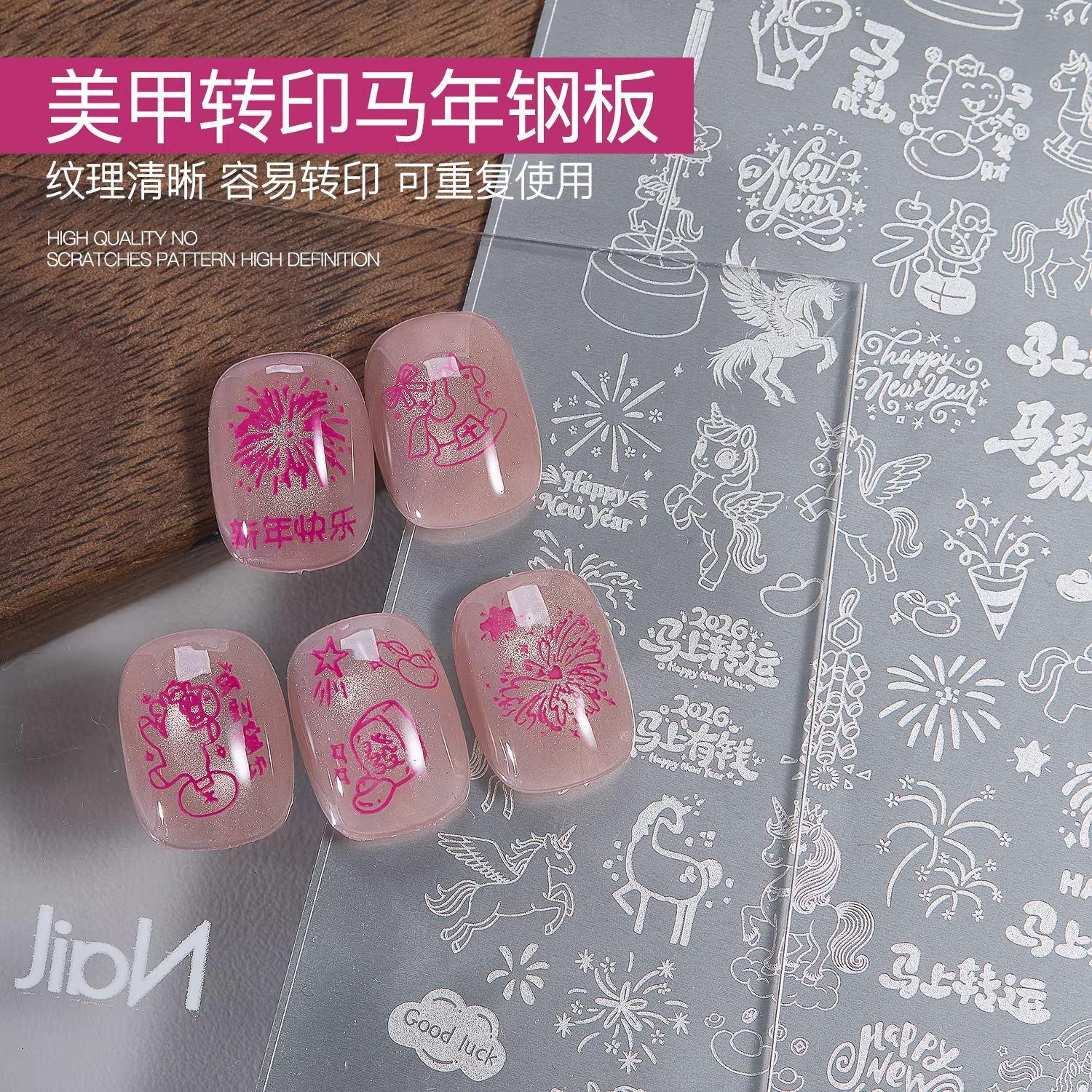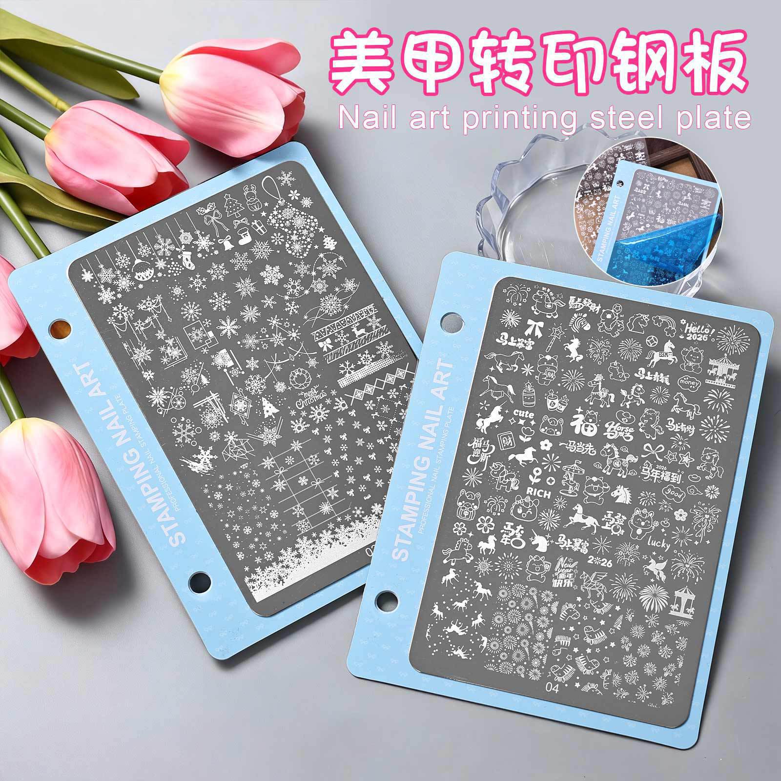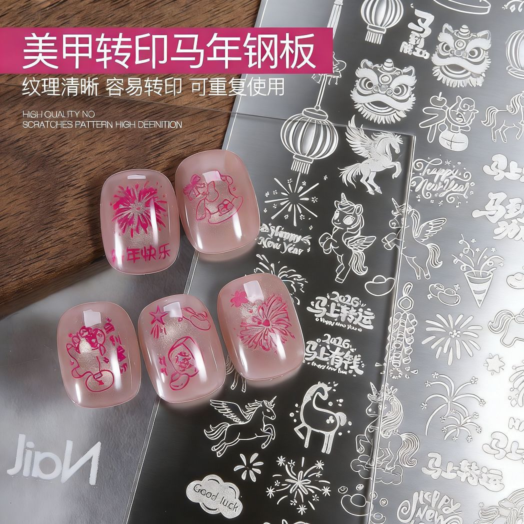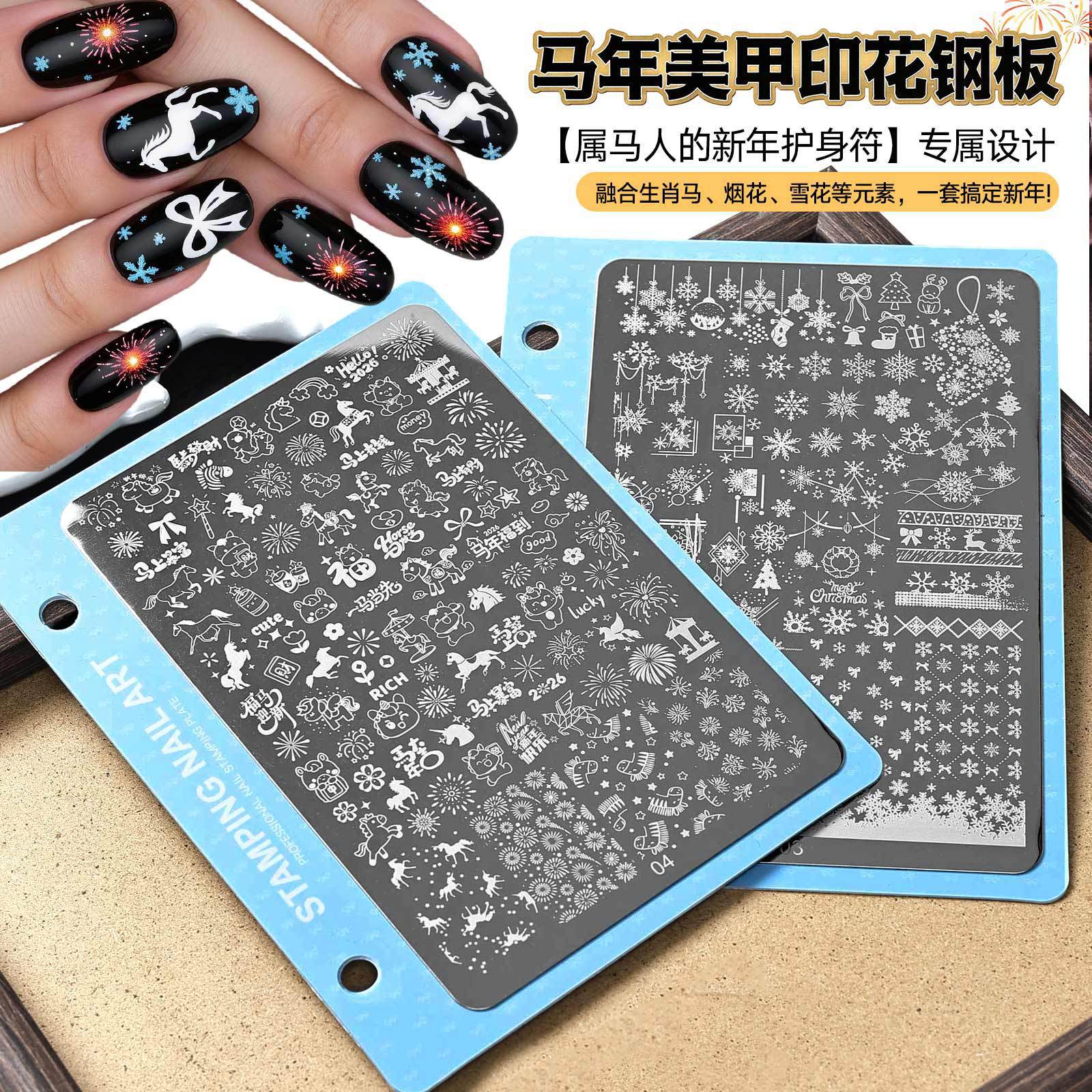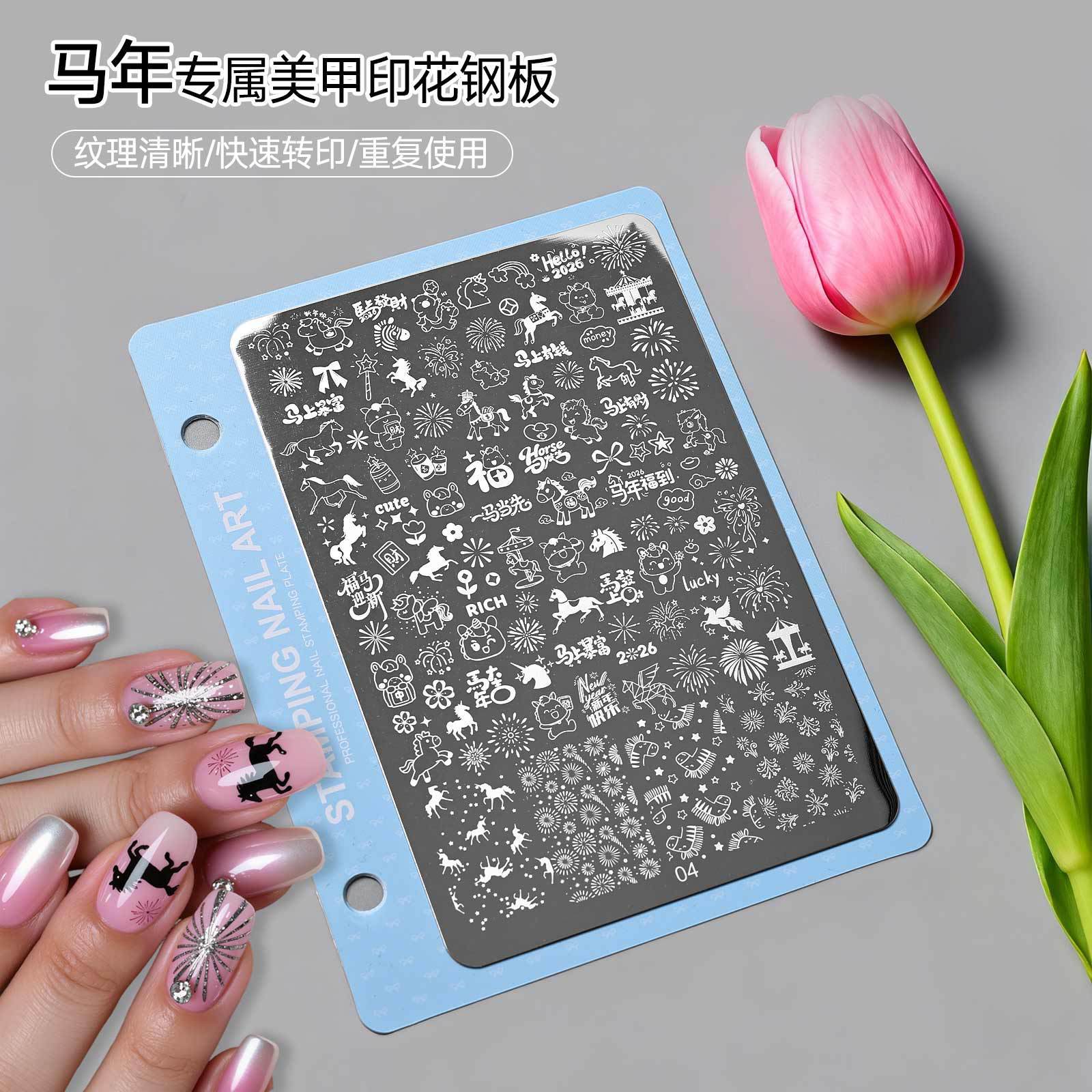 2026马年美甲印花钢板新年小马烟花图案模板指甲转印板美甲店工具