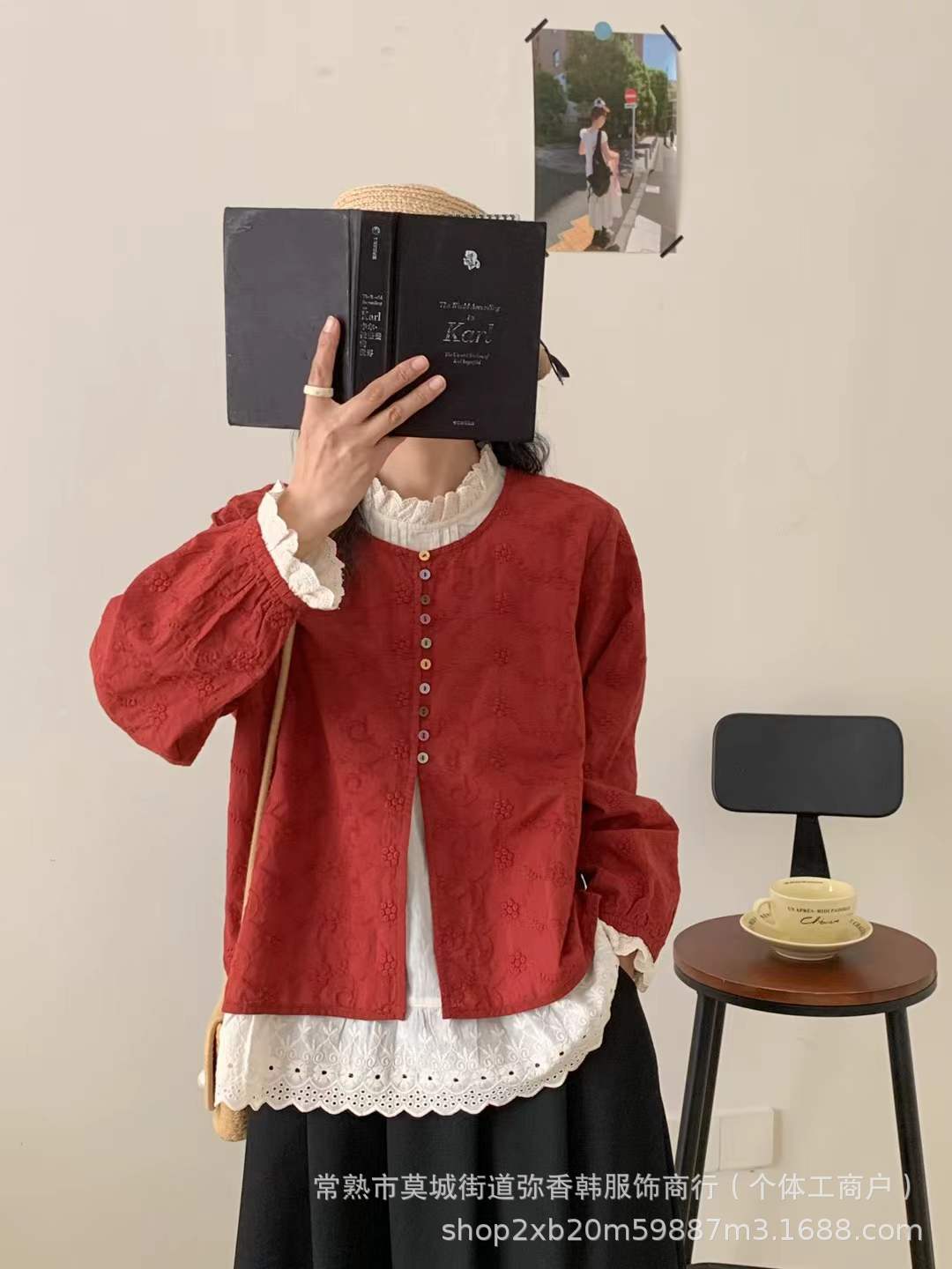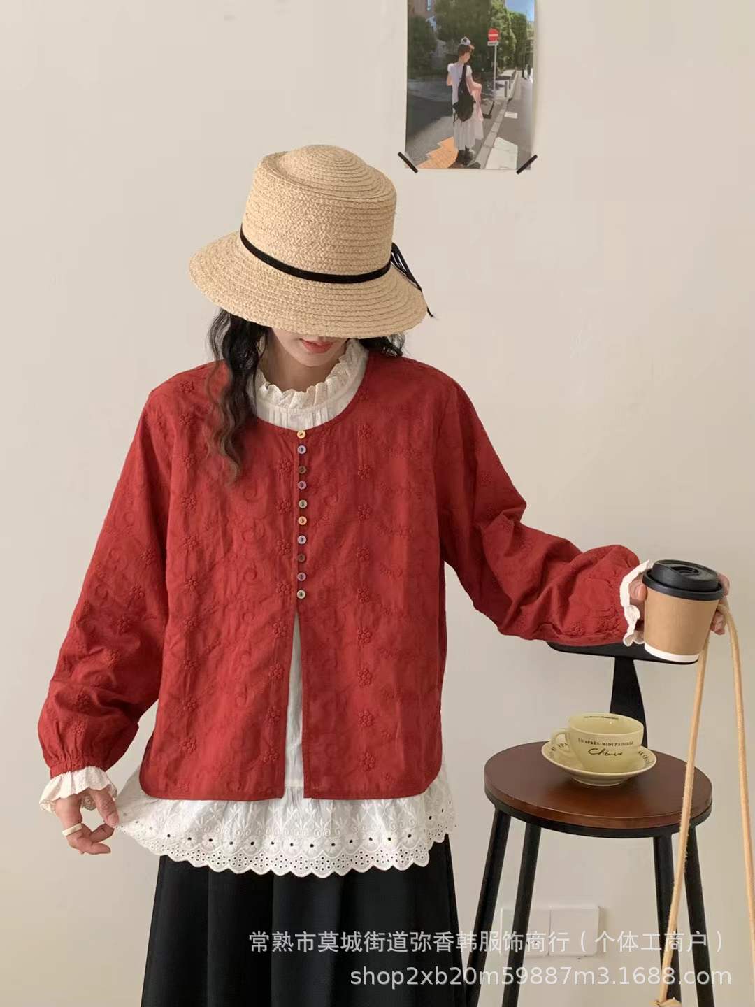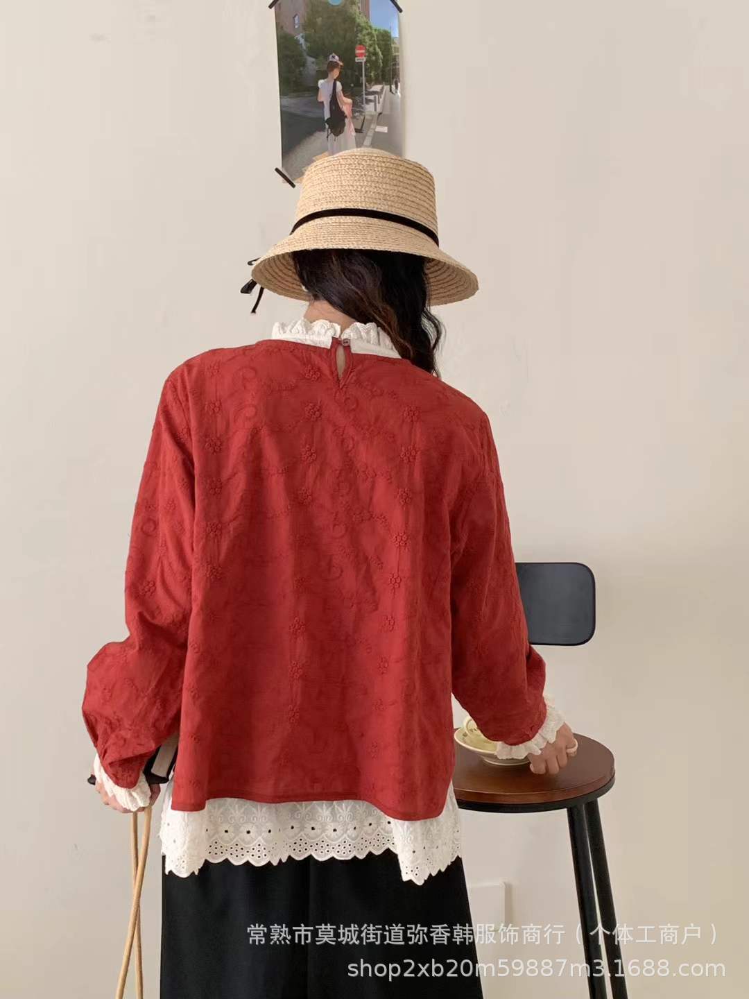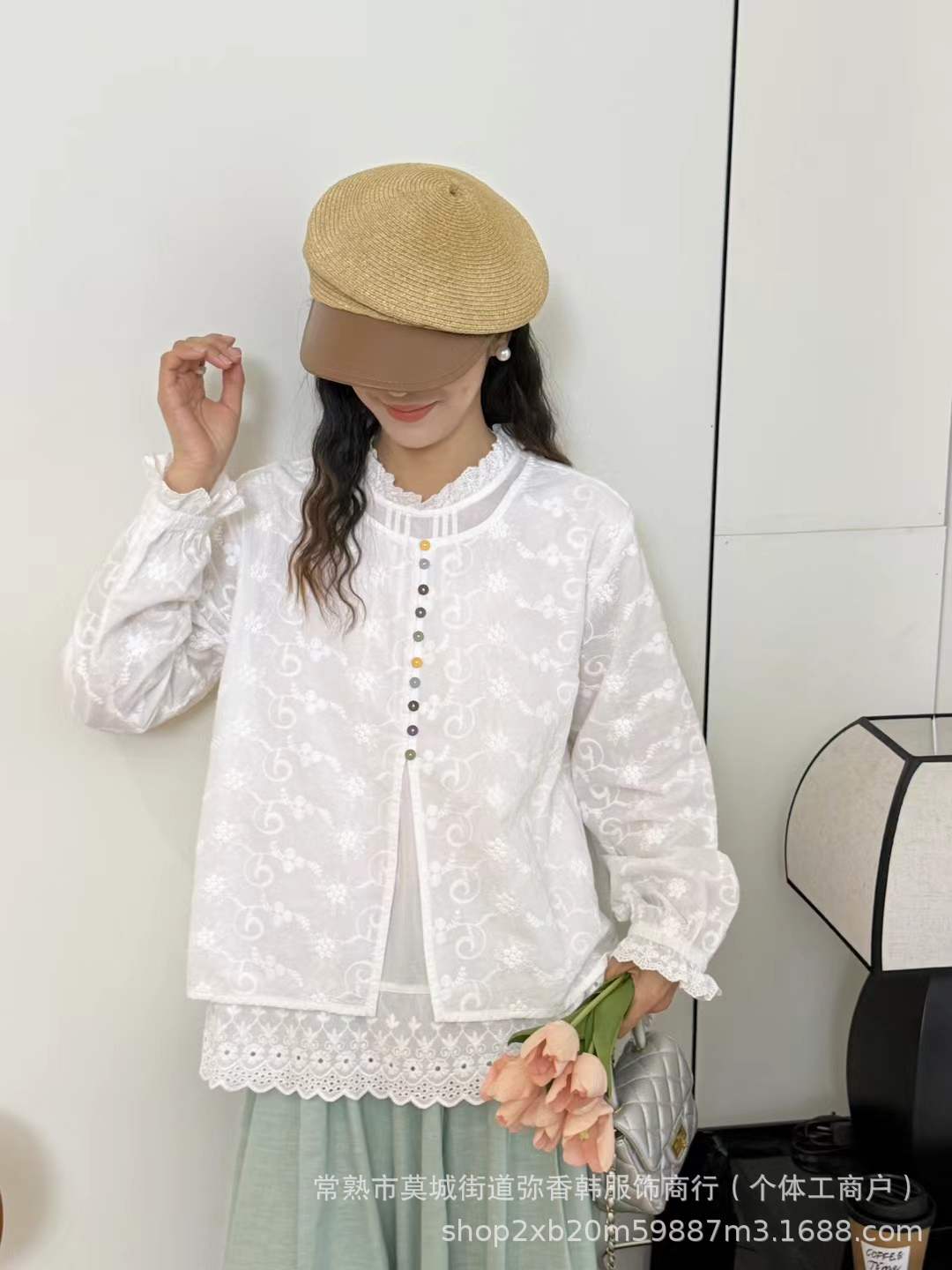 春装新款女装花边圆领彩扣假两件套头上衣刺绣纯色长袖衬衫宽松