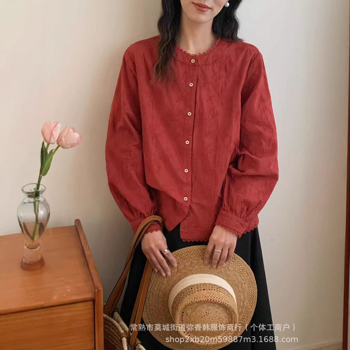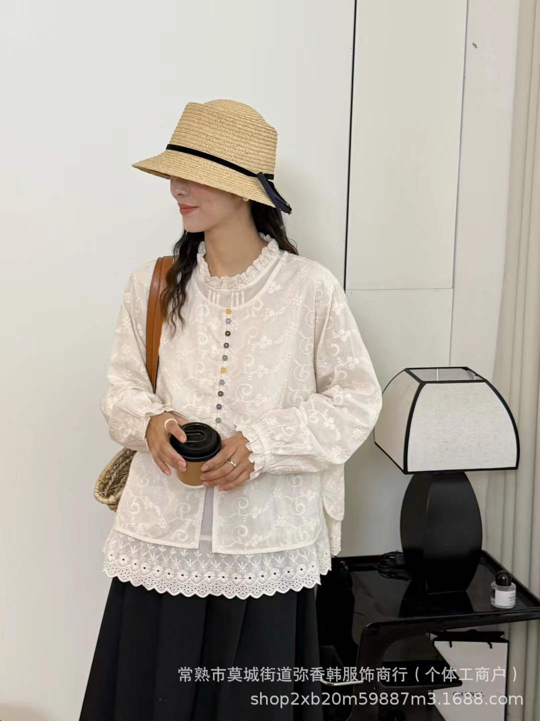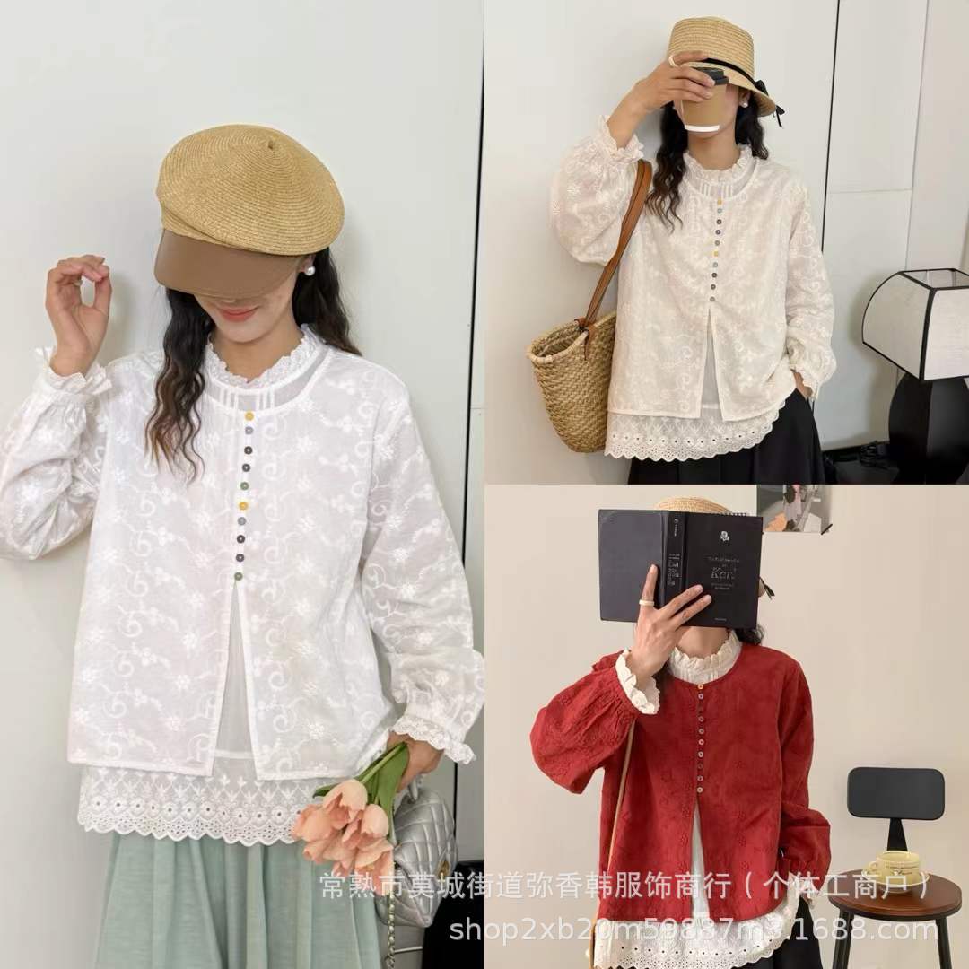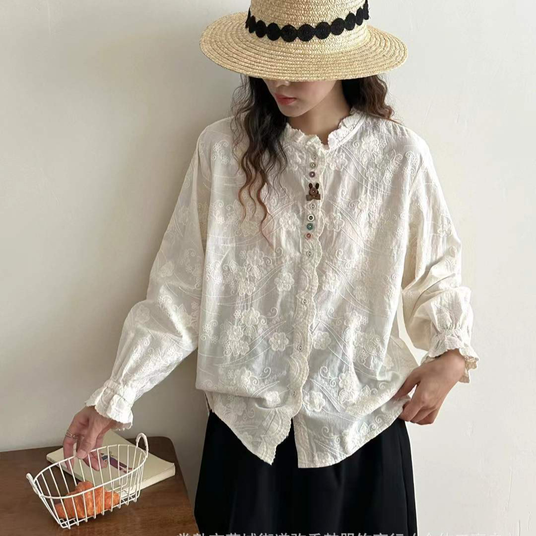 重工刺绣木耳边长袖衬衫2025日系森女系立领减龄显瘦百搭宽松上衣
