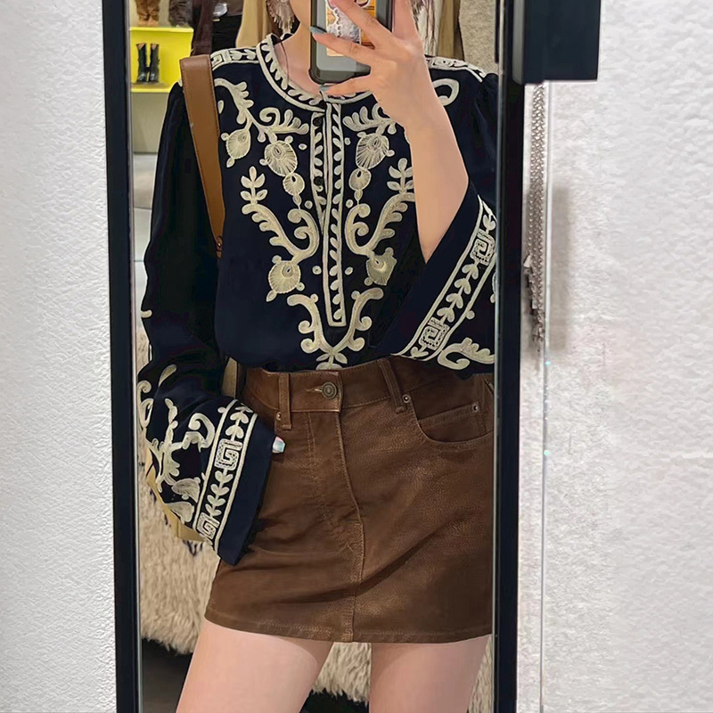 法式小众 2025秋冬复古宫廷花式刺绣绉纱喇叭袖圆领套头衬衣25594