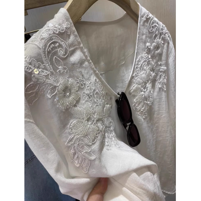 ラストオーダー!!買うと儲かる〜フレンチハイGI感ビーズ刺繍コットンリネンVネックシャツ女性用2025