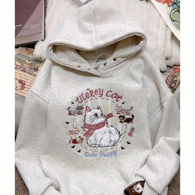 韩系卡通风可爱猫咪植绒刺绣连帽卫衣设计感小众百搭情侣上衣外套
