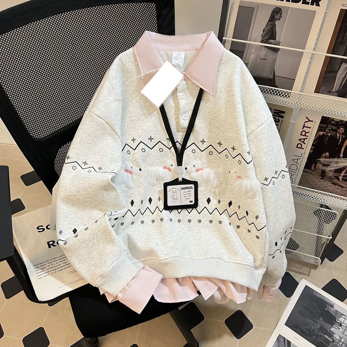 可爱小狗刺绣POLO领假两件卫衣女宽松慵懒风长袖上衣少女休闲套头