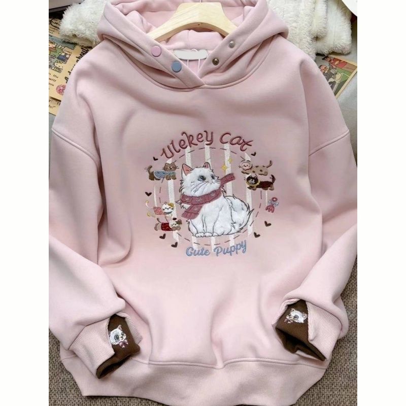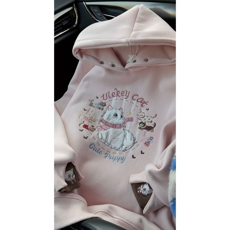 甜美少女感粉色卡通刺绣连帽卫衣女秋冬新款宽松加绒加厚保暖上衣
