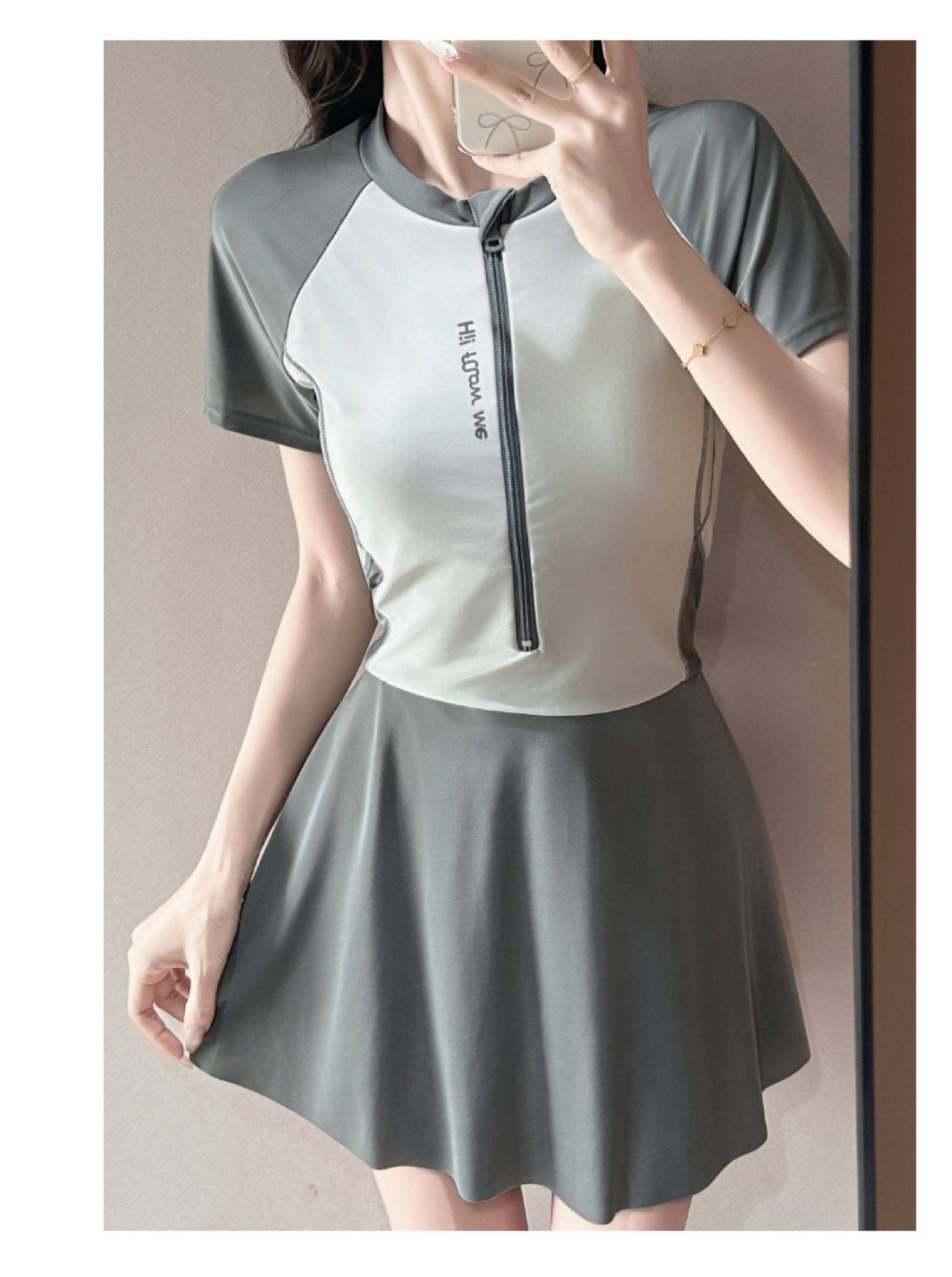 2026新款泳衣女运动风少女连体平角保守显瘦遮肚裙式温泉度假泳装