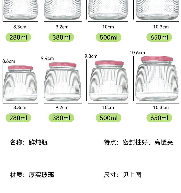 280ML新竖纹鲜炖瓶(80只/箱);透明,380ML新竖纹鲜炖瓶(72只/箱);透明,500ML新竖纹鲜炖瓶(72只/箱);透明,650ML新竖纹鲜炖瓶(60只/箱);透明,280ML星钻鲜炖瓶(80只/箱);透明,380ML星钻鲜炖瓶(72只/箱);透明,500ML星钻鲜炖瓶(72只/箱);透明,650ML星钻鲜炖瓶(60只/箱);透明,380ml竖纹炖汤瓶;透明,500ML竖纹炖汤瓶(72只/箱);透明,650ML竖纹炖汤瓶(48只/箱);透明,380ml星钻炖汤瓶;透明,500ML星钻炖汤瓶(72只/箱);透明,650ML星钻炖汤瓶(48只/箱);透明,500ML光板炖汤瓶(72只/箱);透明,650ML光板炖汤瓶(48只/箱);透明,炖汤瓶盖子;透明,鲜炖瓶盖子;透明