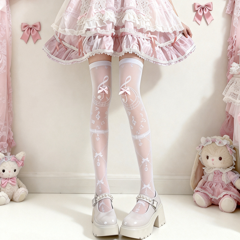「音符悠舞」洛丽塔lolita提花大腿袜甜美少女超薄蝴蝶结长筒丝袜