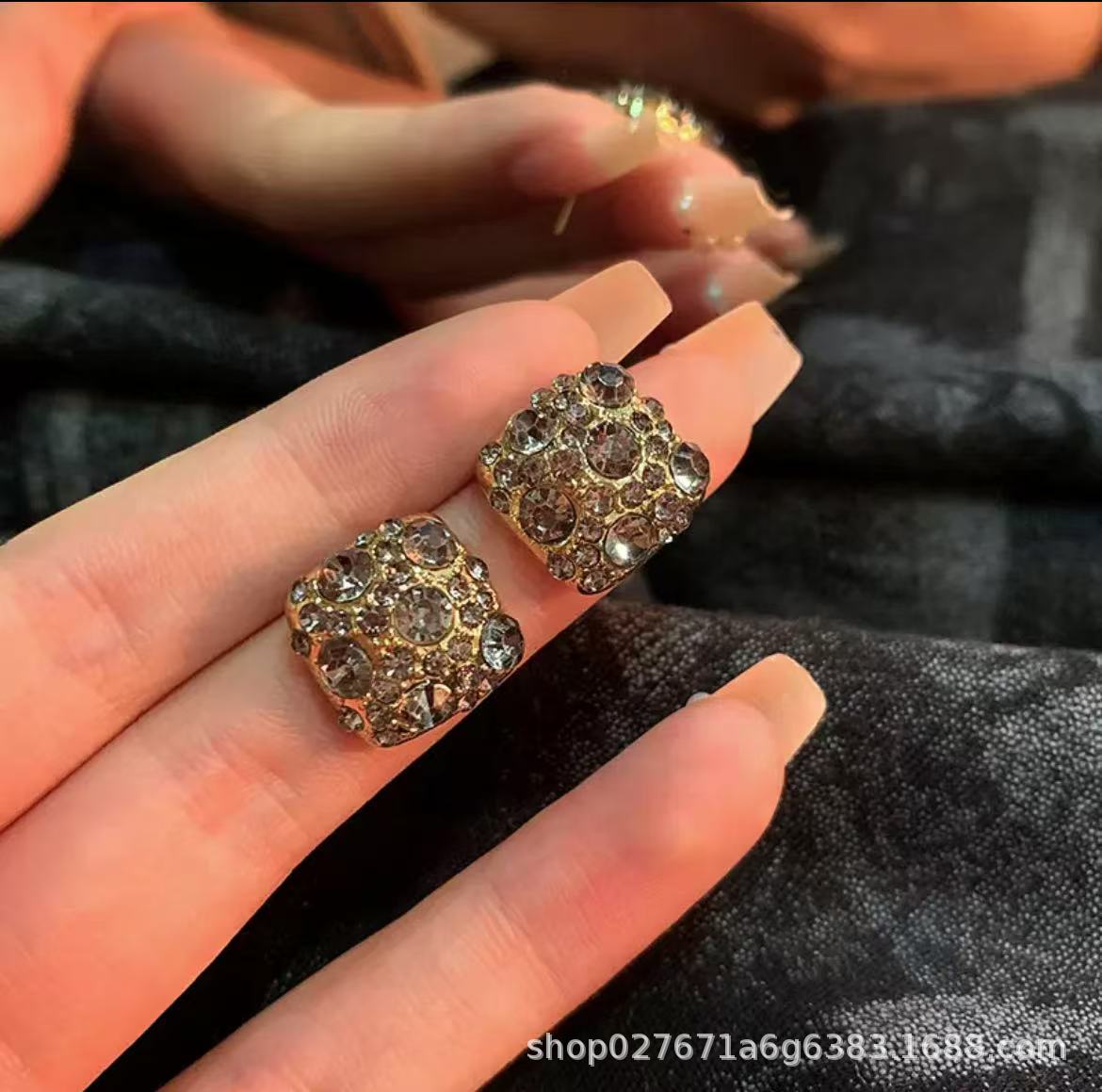 轻奢小众超闪四方满钻耳钉几何茶色方形耳环韩系时尚百搭气质耳饰