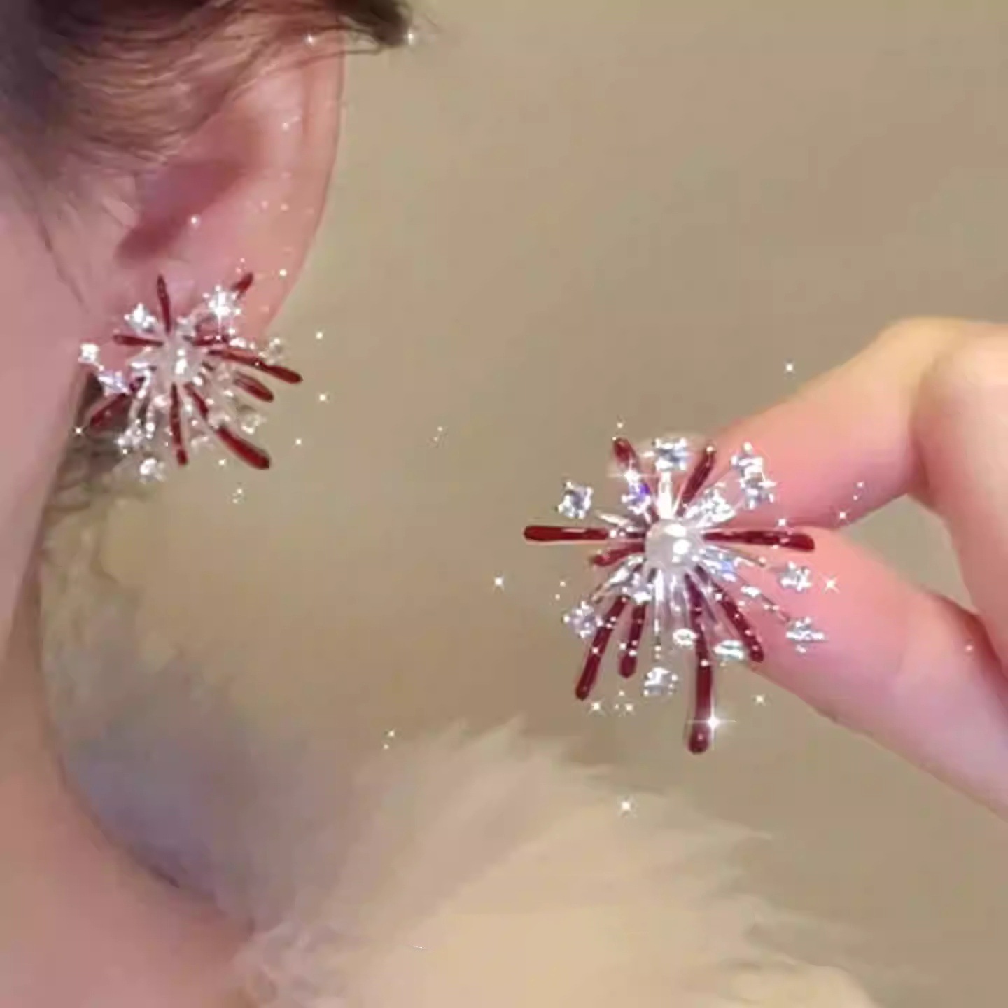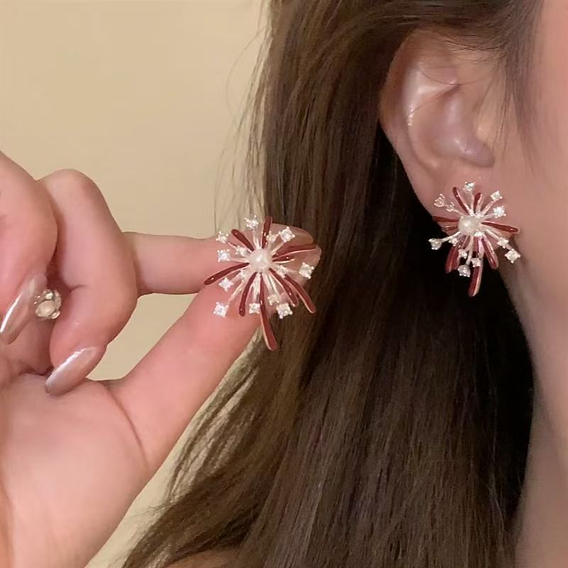 新款红色滴釉锆石珠珠烟花耳环女款轻奢高级感精致超闪时尚百新年