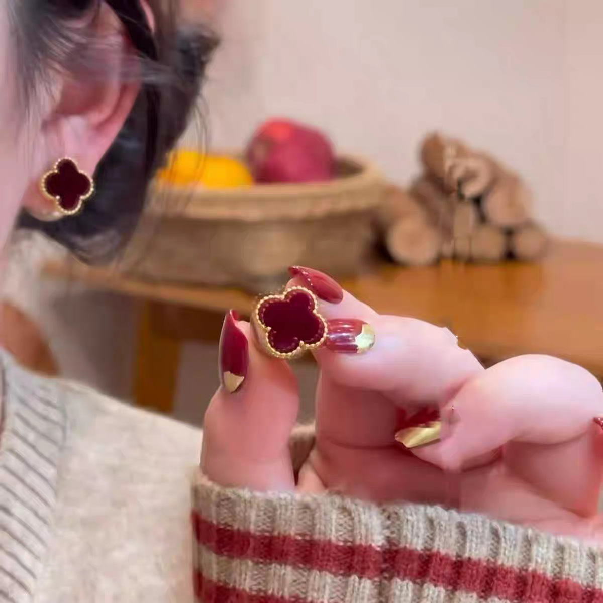 秋冬新款红色四叶草珠珠耳钉前后戴设计时尚轻奢耳钉一款两戴