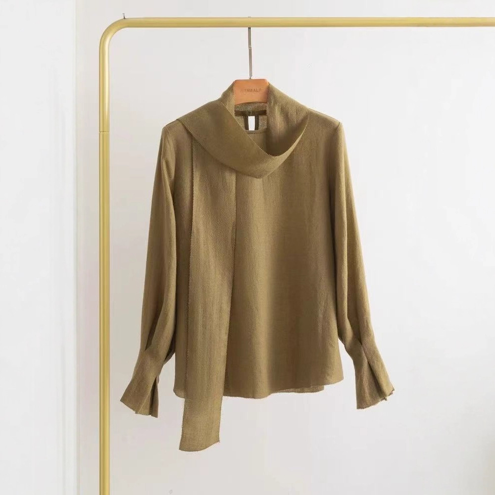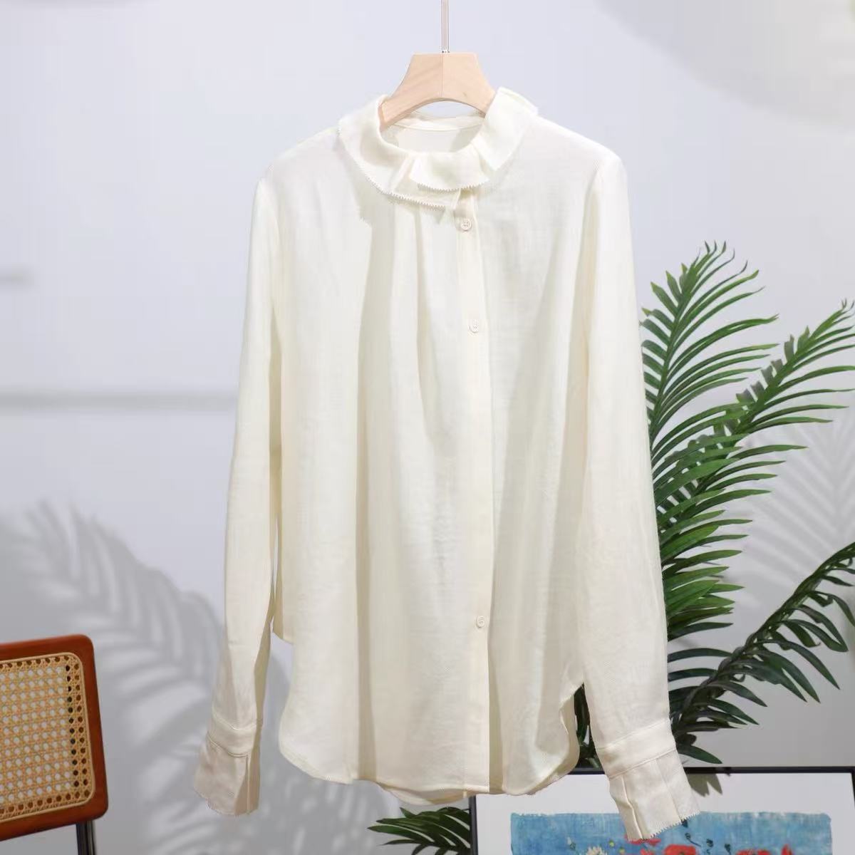 法式天丝花苞领上衣女早春叠穿不规则百搭宽松显瘦轻奢长袖衬衫女