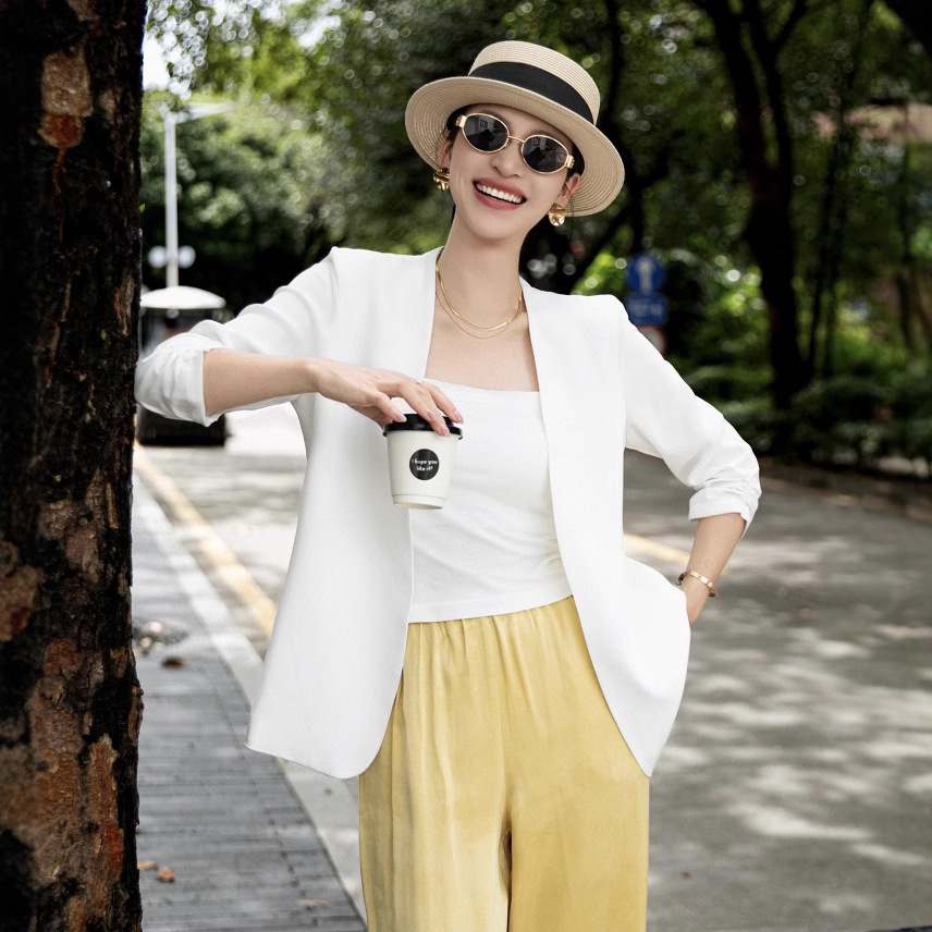 アセテートサテンリネンボタンレスノーカラースーツジャケットレディース夏薄い気質スリムフィット単層七分袖トップ