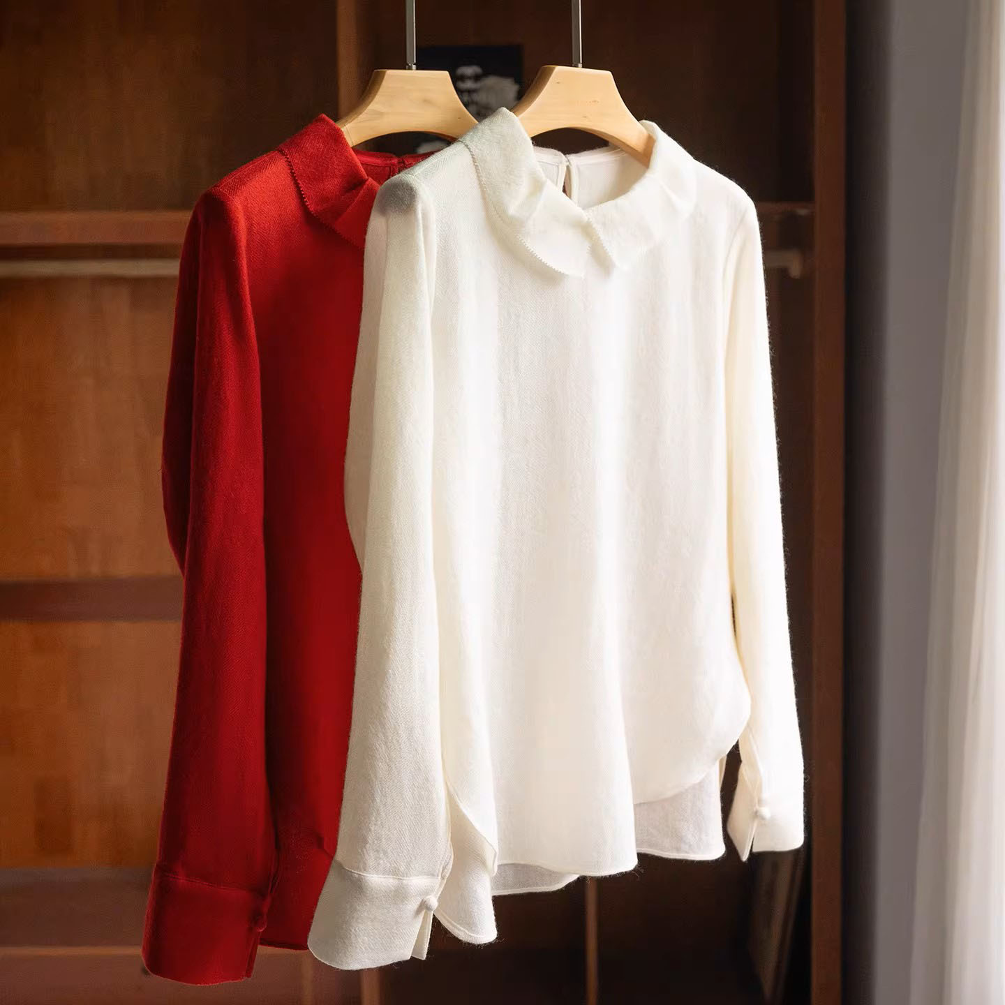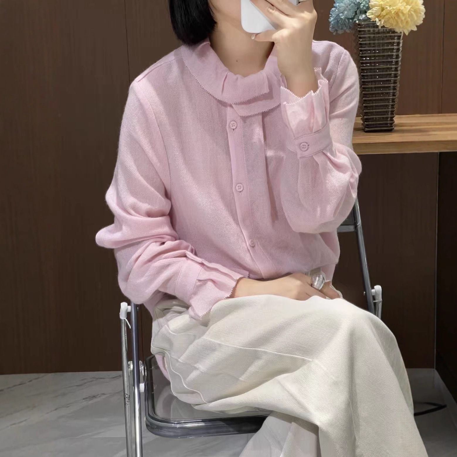 小众品牌2025年秋款100%绵羊毛法式木耳边长袖衬衣