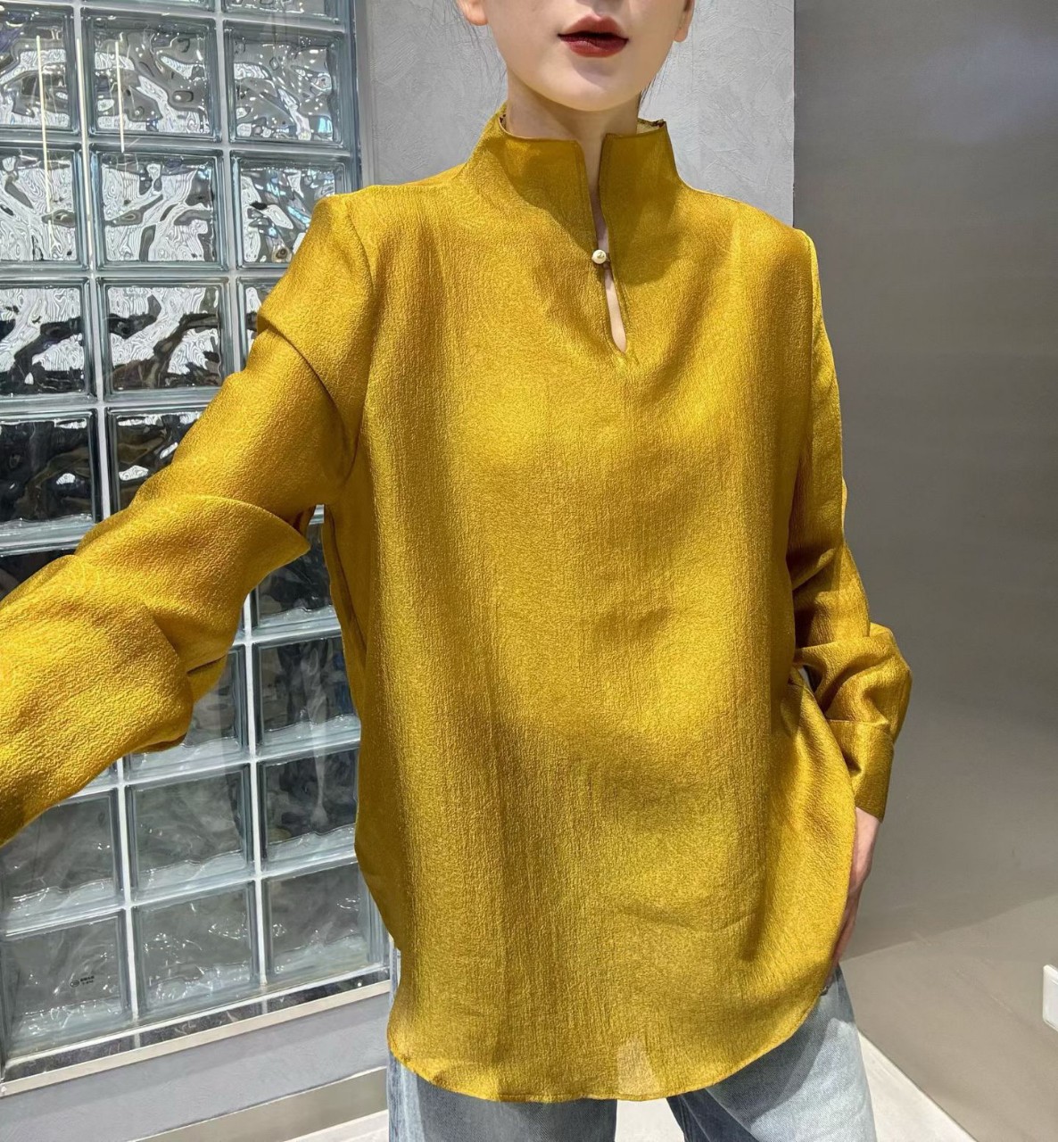 新中式国风立领双层天丝提花上衣女26早春洋气遮肉显瘦款长袖衬衫