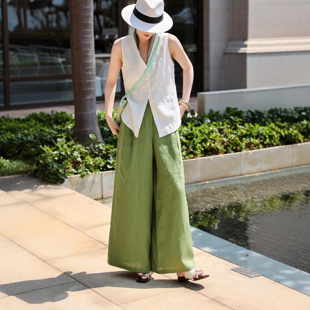 老銭風軽豪華高級2025夏の新型亜麻百合気質高腰で痩せているワイドパンツのストレートパンツ