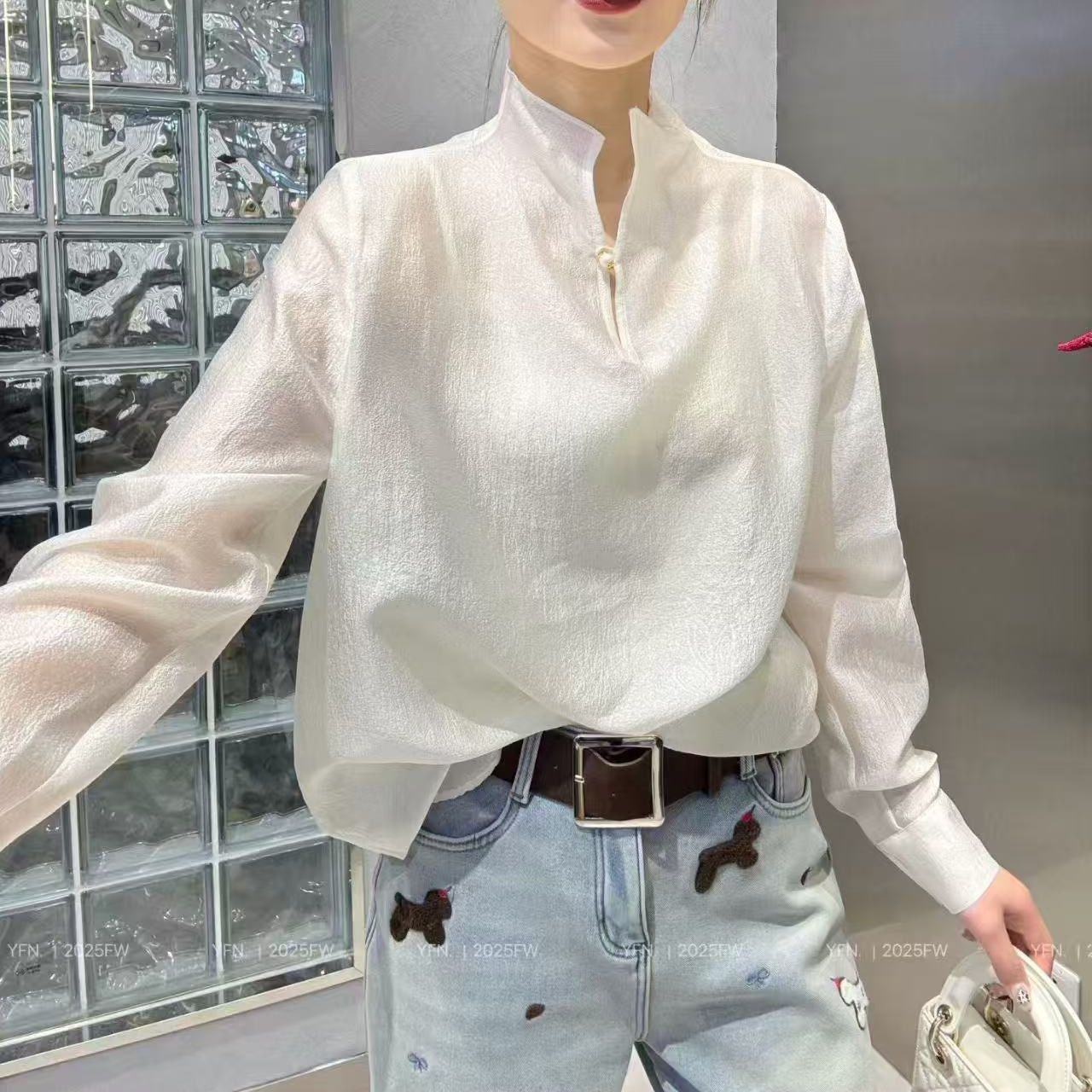 26早春新款腰果花天丝提花上衣一粒扣珍珠扣装饰微透轻薄衬衫124