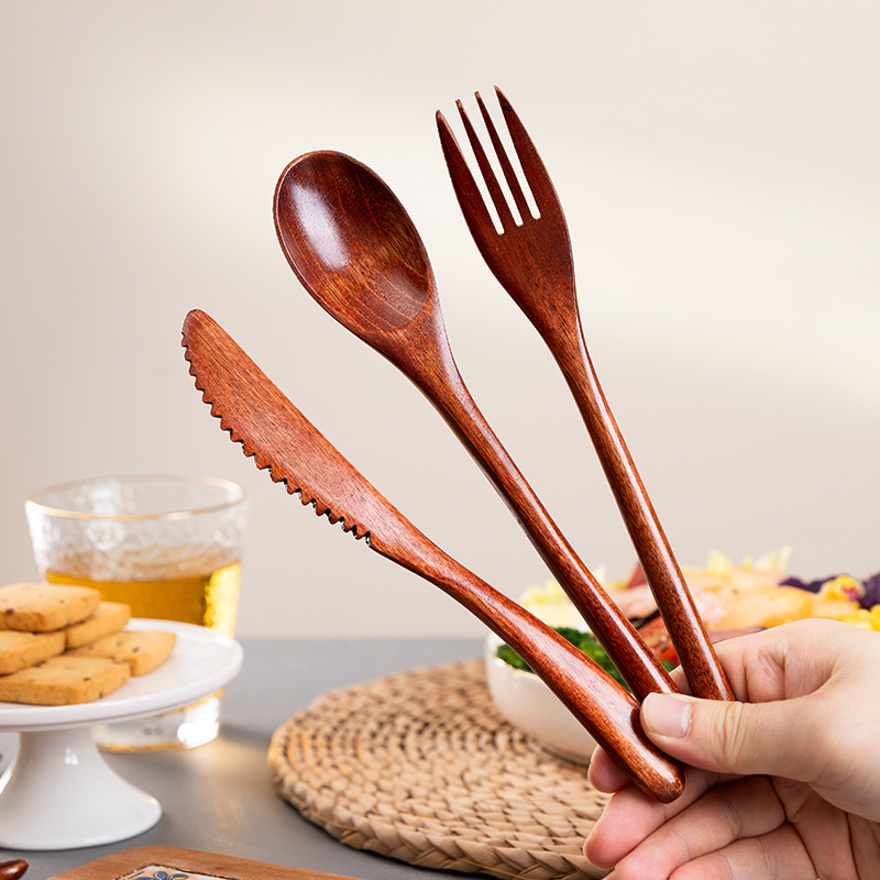 跨境木质刀叉勺三件套装老漆楠木便携式学生餐具家用筷子刀子叉子