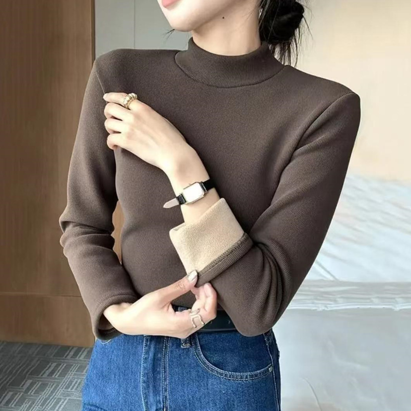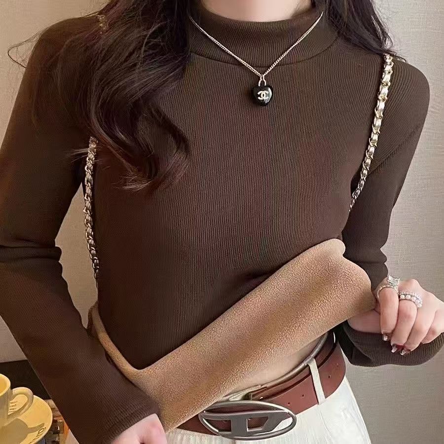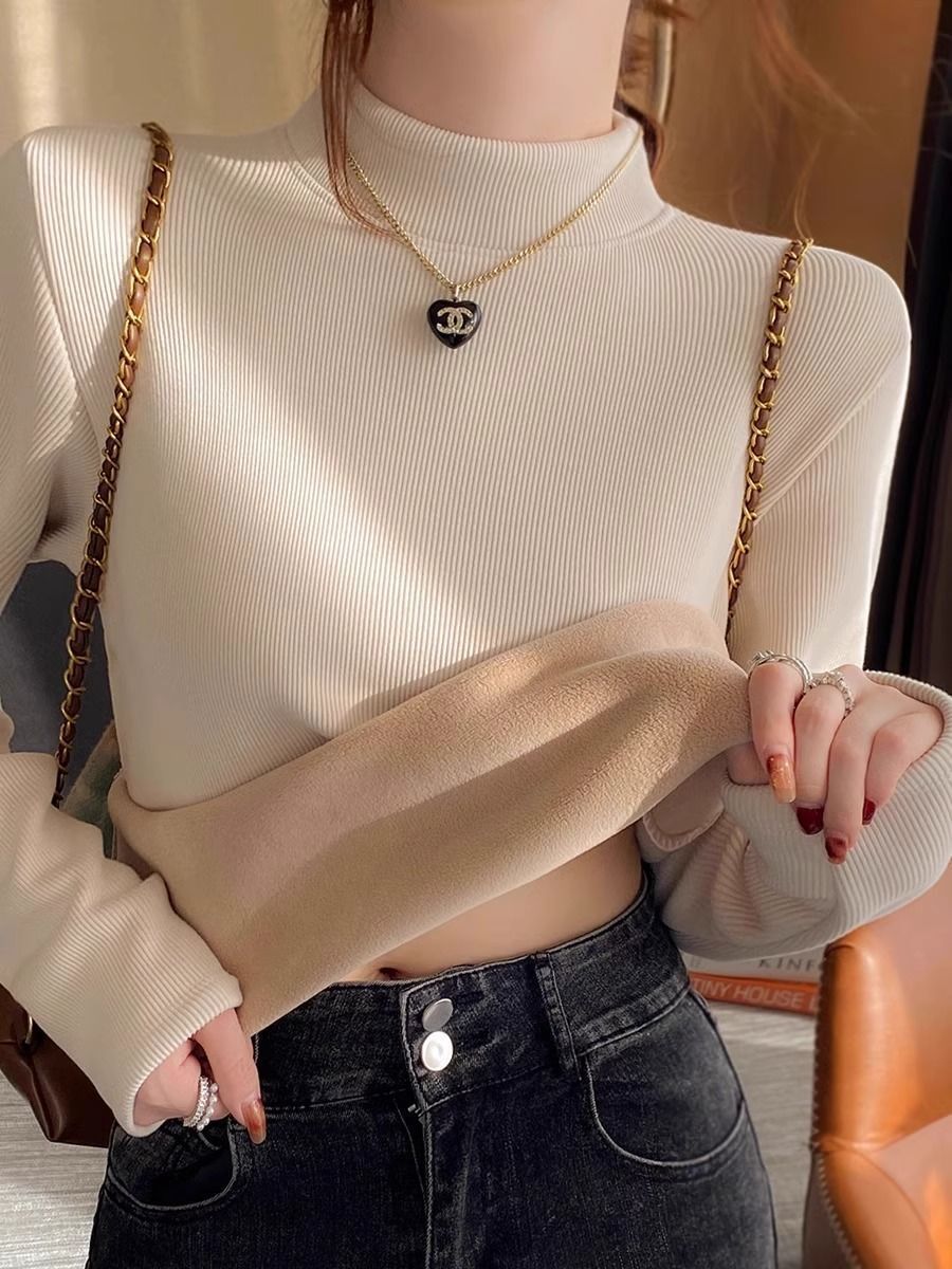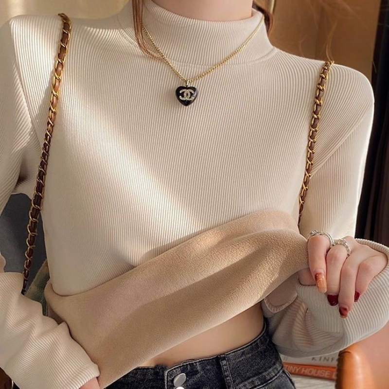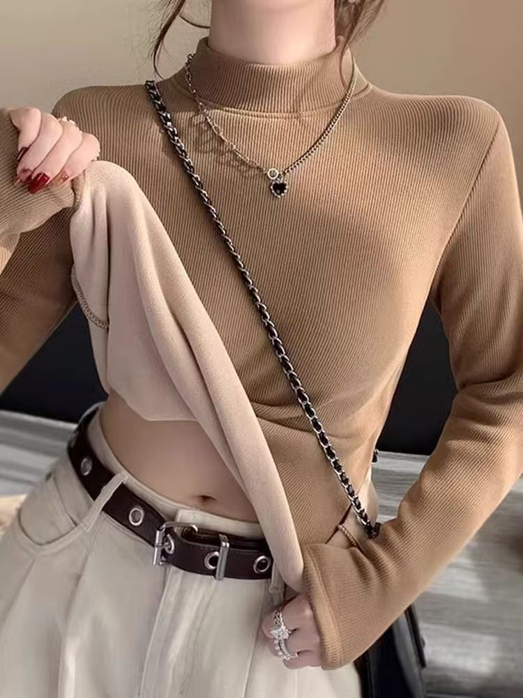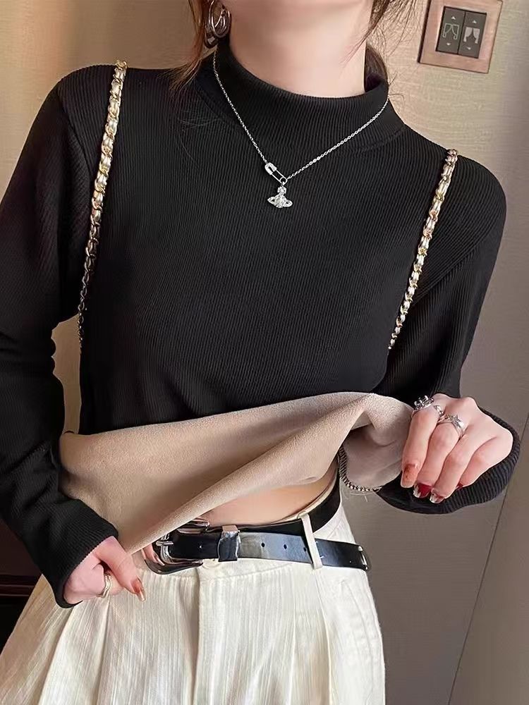 2025冬季新款加绒加厚女士半高领保暖时尚上衣修身百搭外穿打底衫