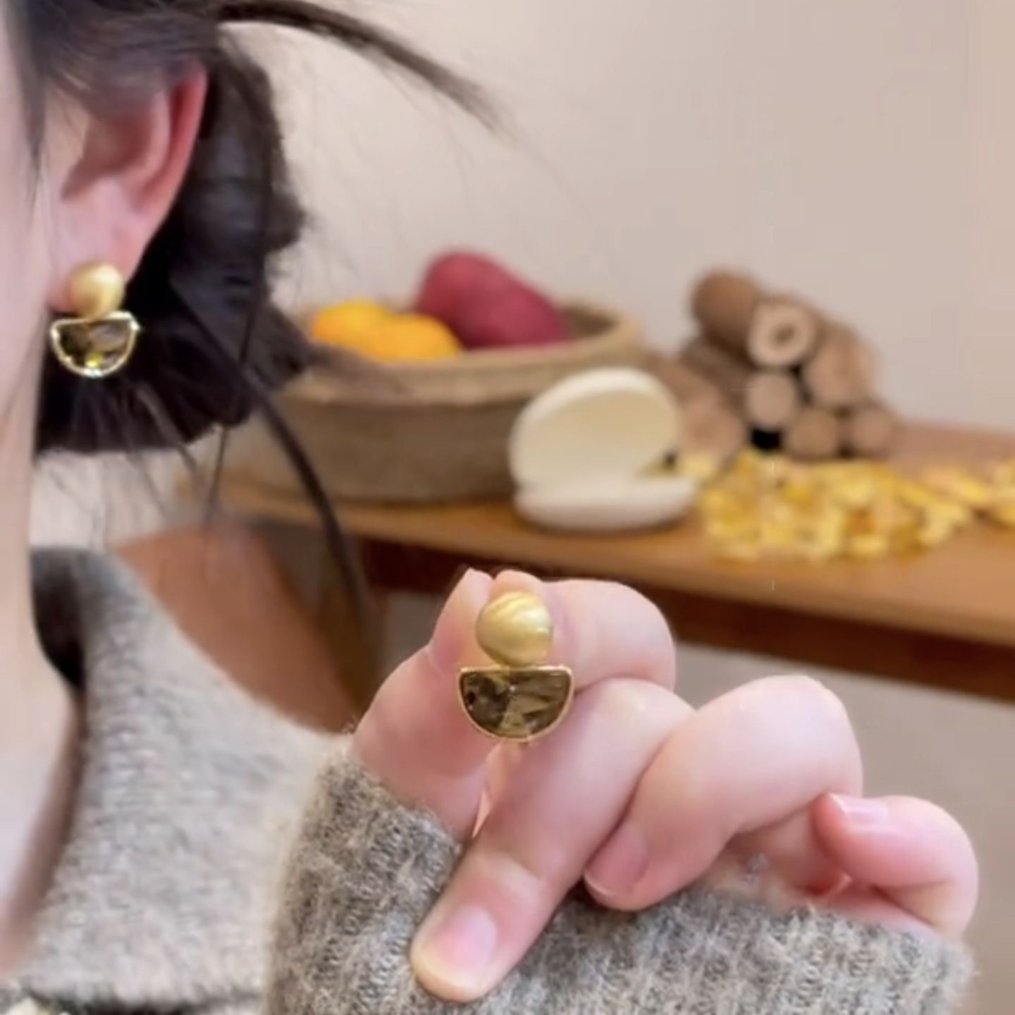 美ラード琥珀円イヤリング秋冬気質レトロ前後にC型耳輪をつけたファッションイヤリング