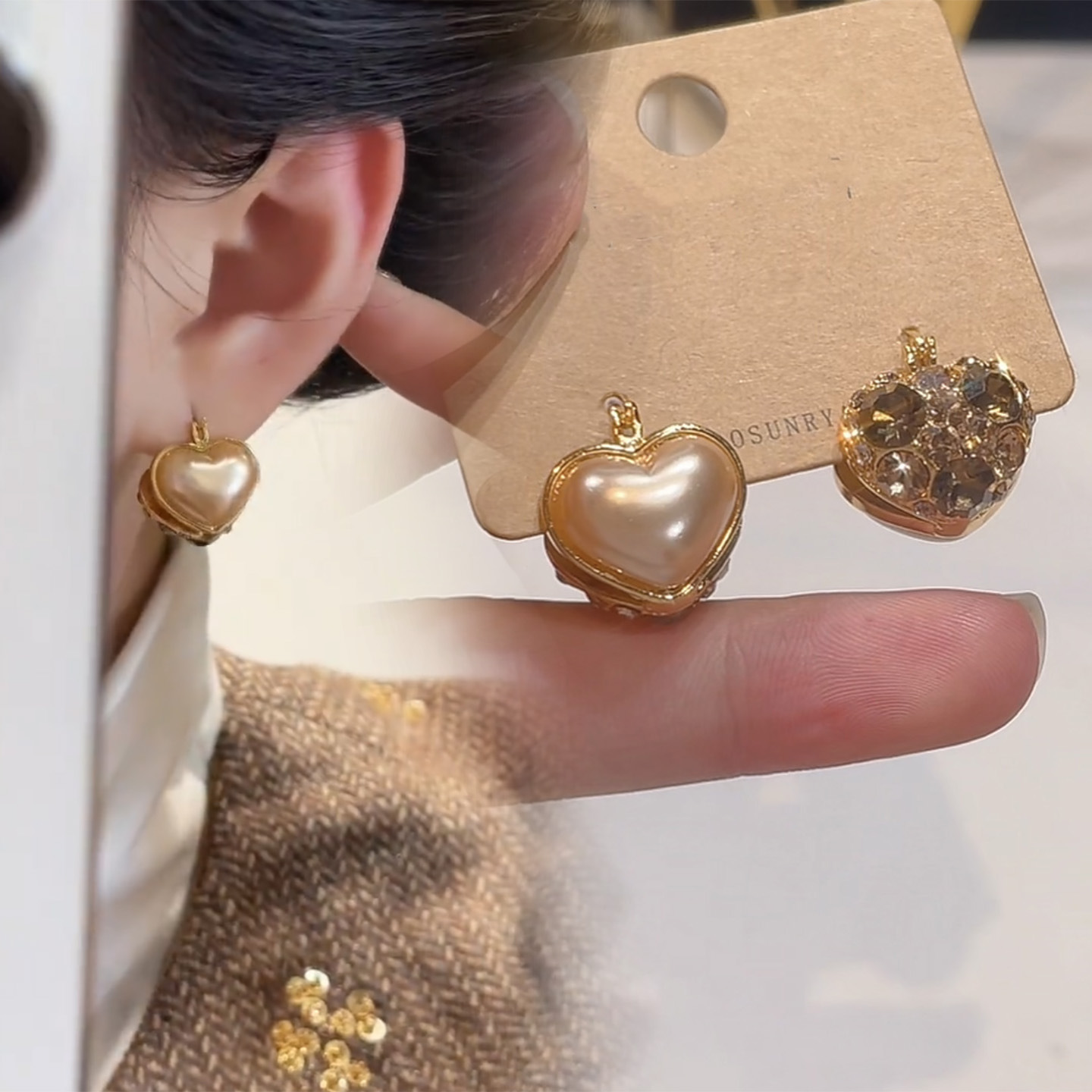 时尚轻奢法式香槟色珍珠锆石爱心双面耳扣女气质百搭耳环精致耳饰