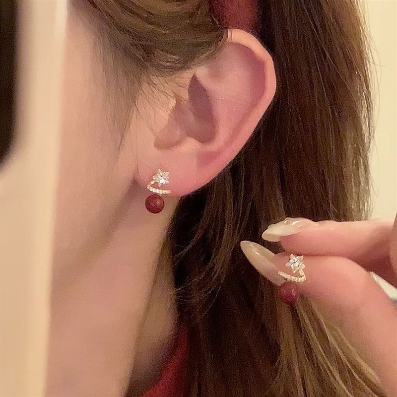 新款秋冬时尚锆石五角星红珠珠耳钉甜美可爱精致小巧新粘百搭款女