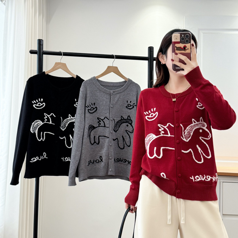 大码女装韩系卡通小马刺绣减龄毛衣外套宽松显瘦圆领针织衫312655