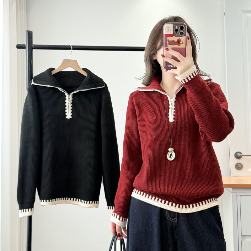 大码女装胖妹妹显瘦大翻领设计感毛衣宽松慵懒风撞色针织衫SP2004