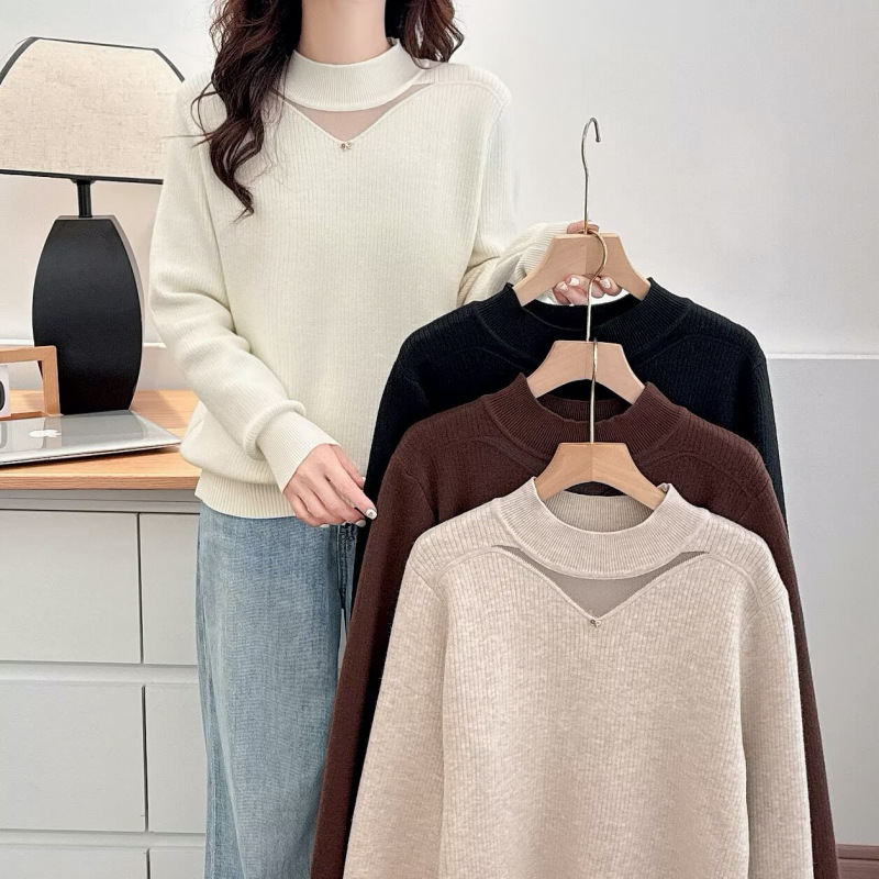 大码女装时尚设计感镂空加绒加厚针织衫显瘦半高领保暖毛衣032486
