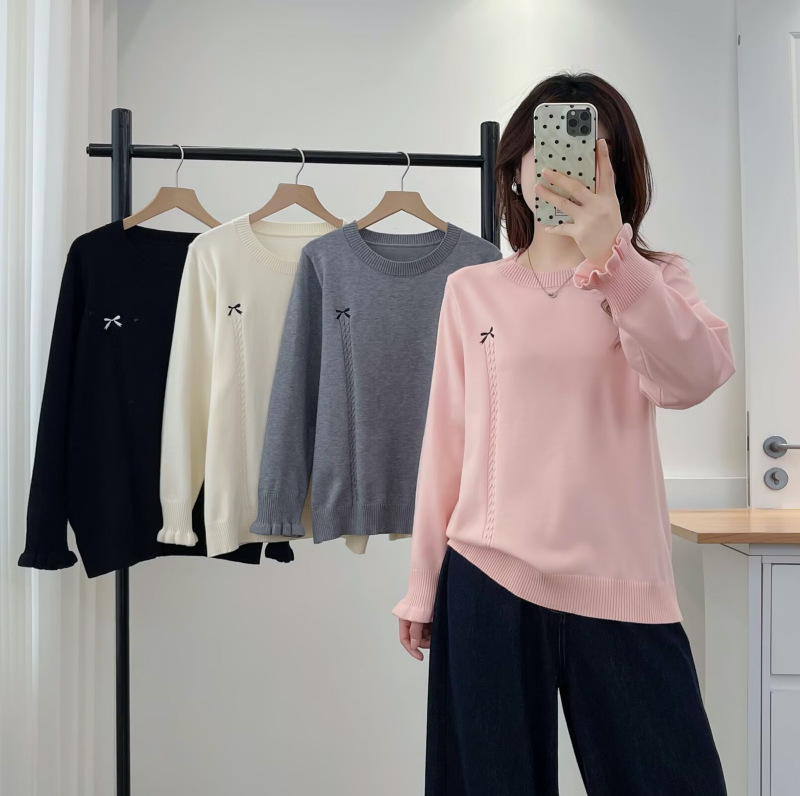 大码女装简约舒适花瓣袖口休闲毛衣秋季宽松显瘦圆领针织衫742319