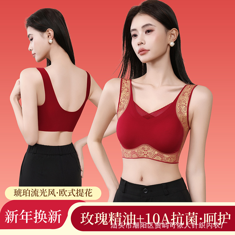 本命年大红印花提拉内衣女士大码文胸聚拢下垂承托收副乳无痕背心