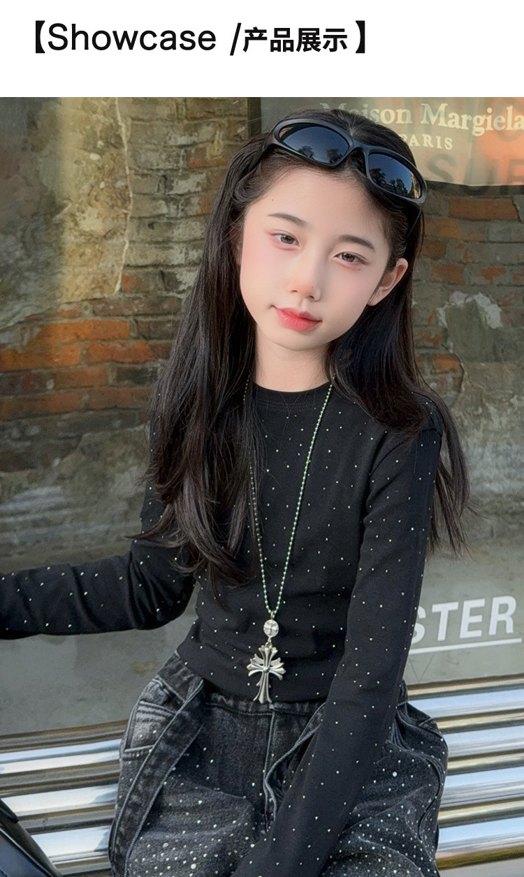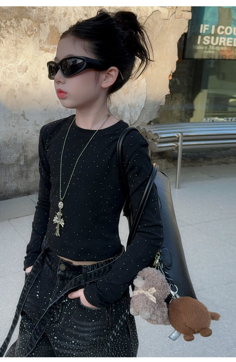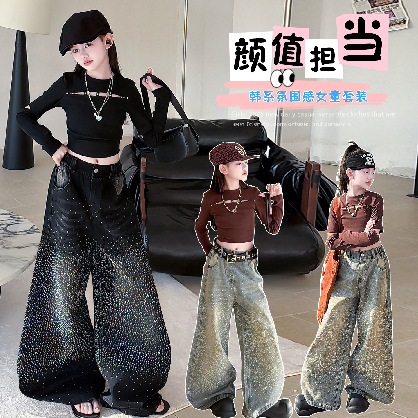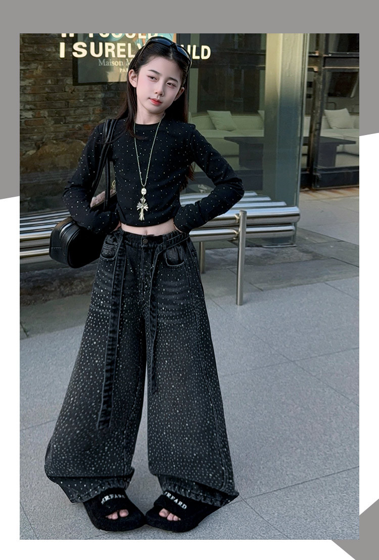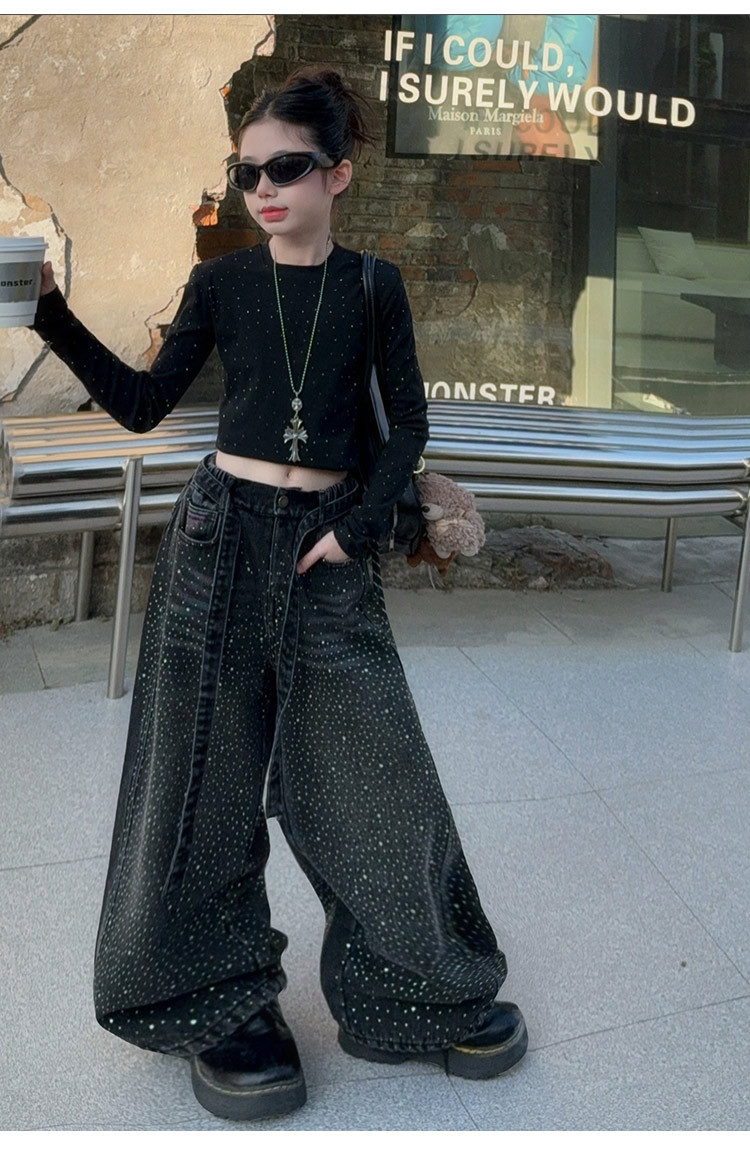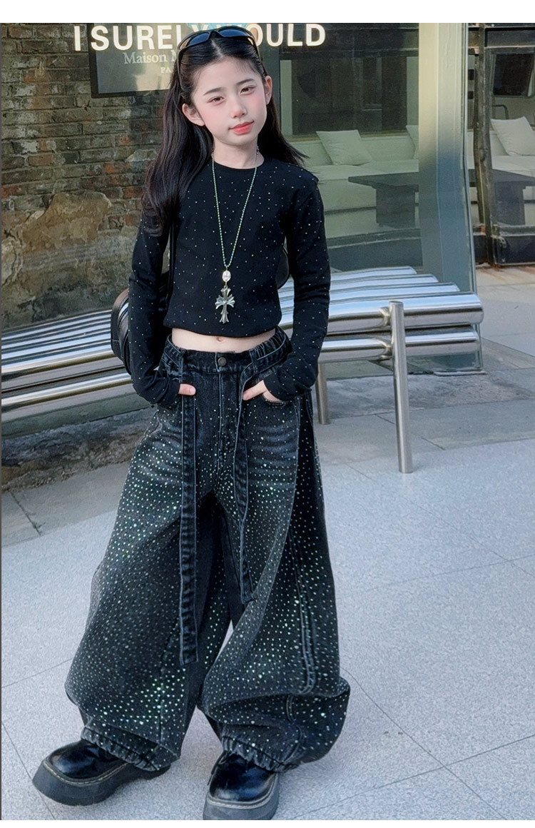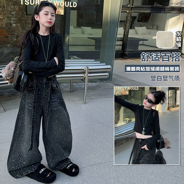 女童套装2026春季新款闪亮满天星高腰烫钻牛仔阔腿裤时髦潮酷上衣