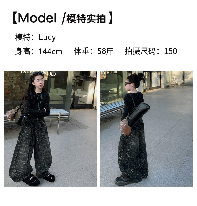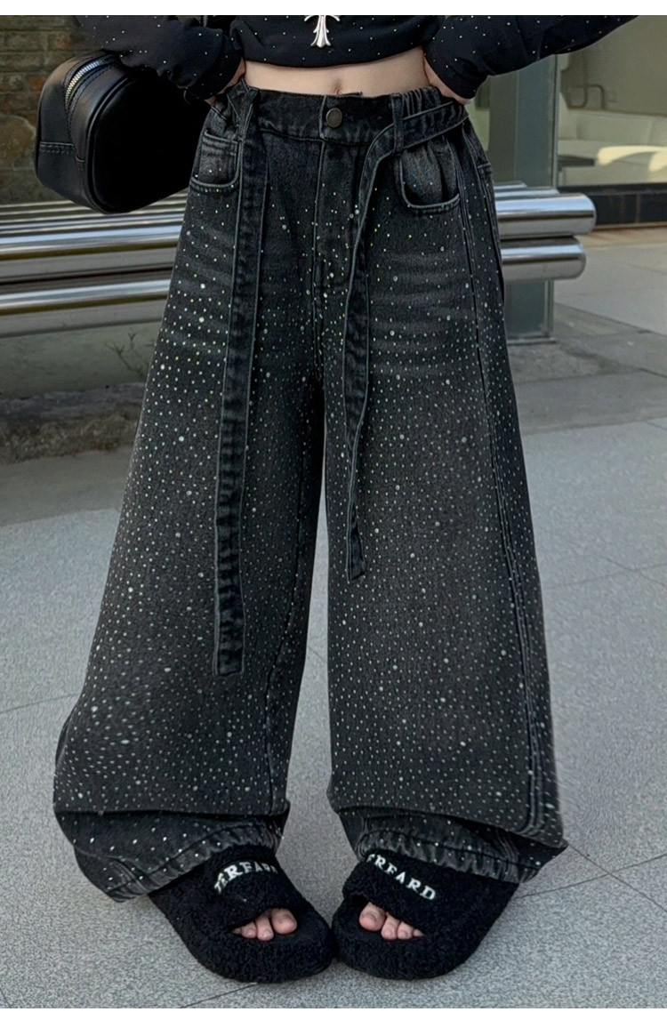美式满天星烫钻拼接牛仔裤女童2026春款时尚宽松慵懒松弛感阔腿裤