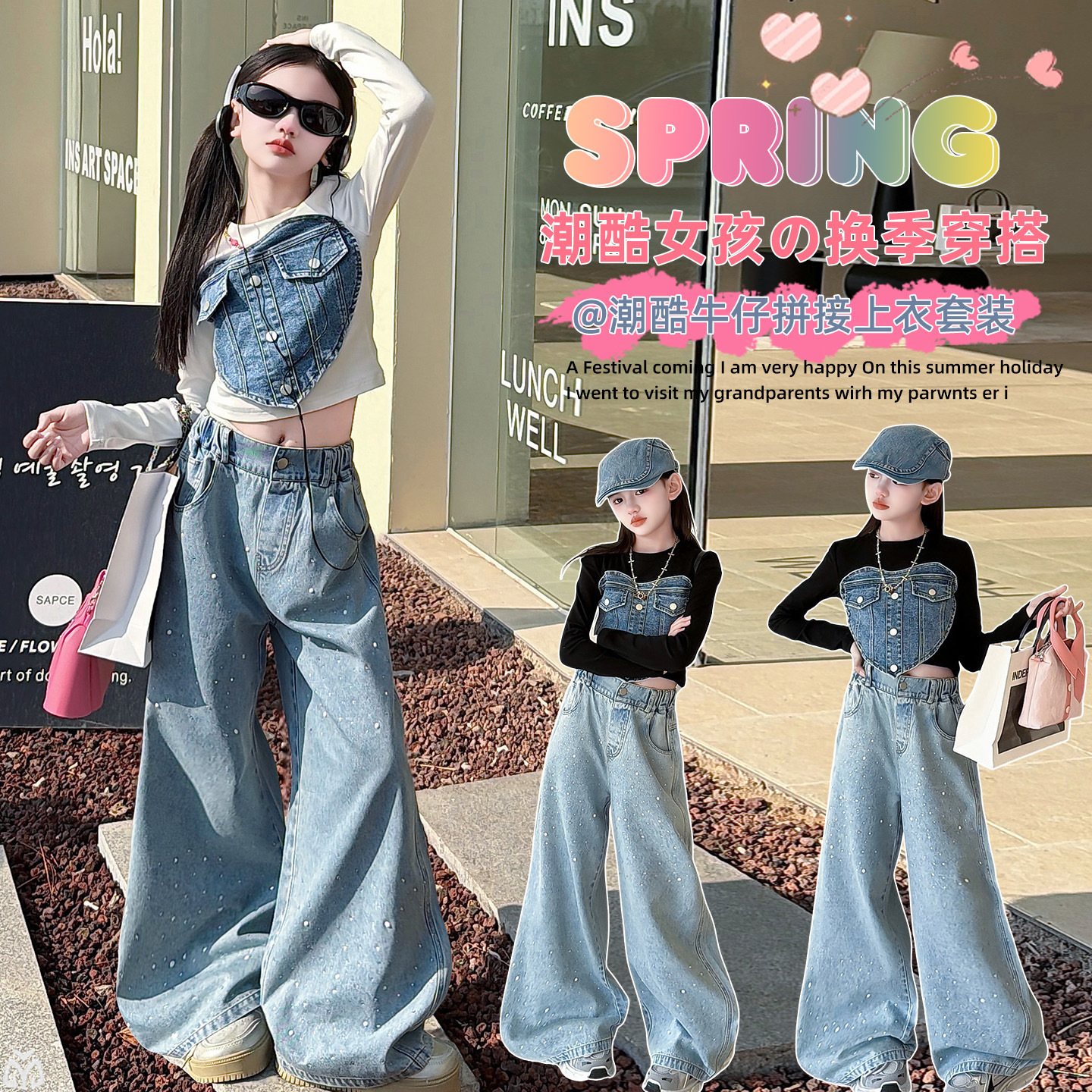 女童韩系套装2026春季新款甜酷爱心牛仔拼接上衣宽松烫钻牛仔阔腿
