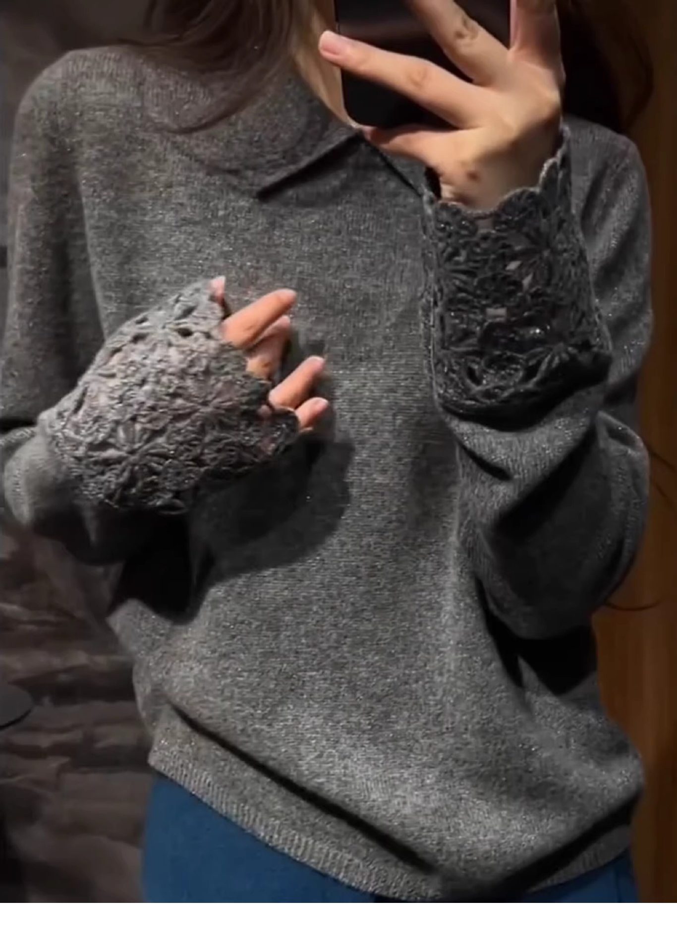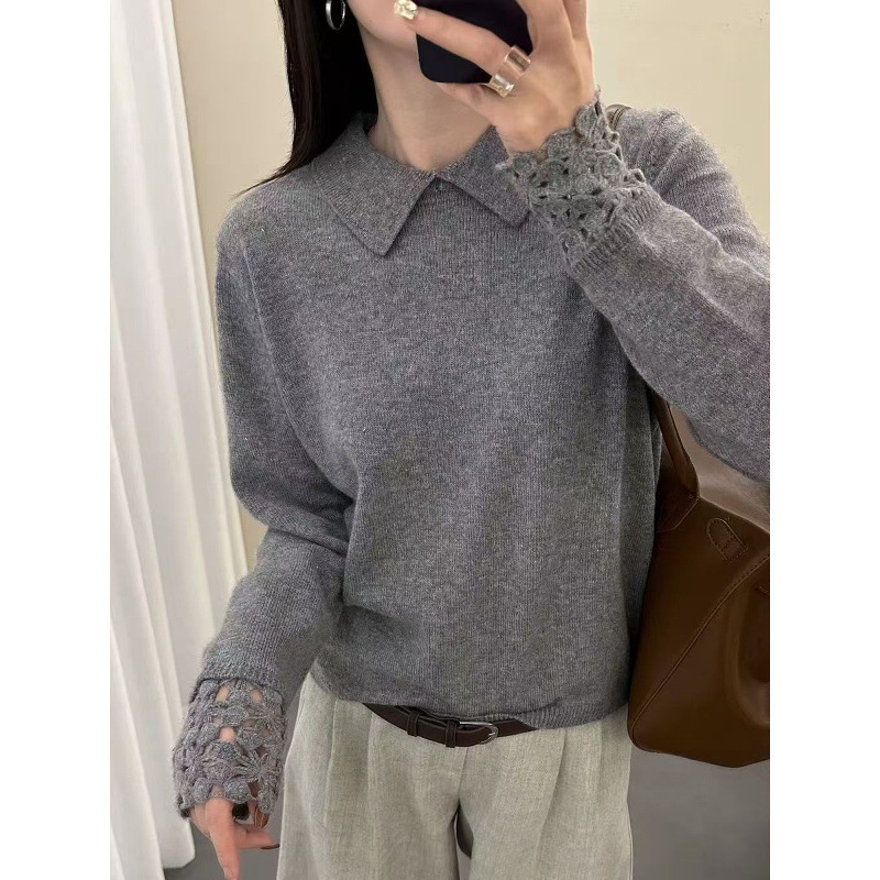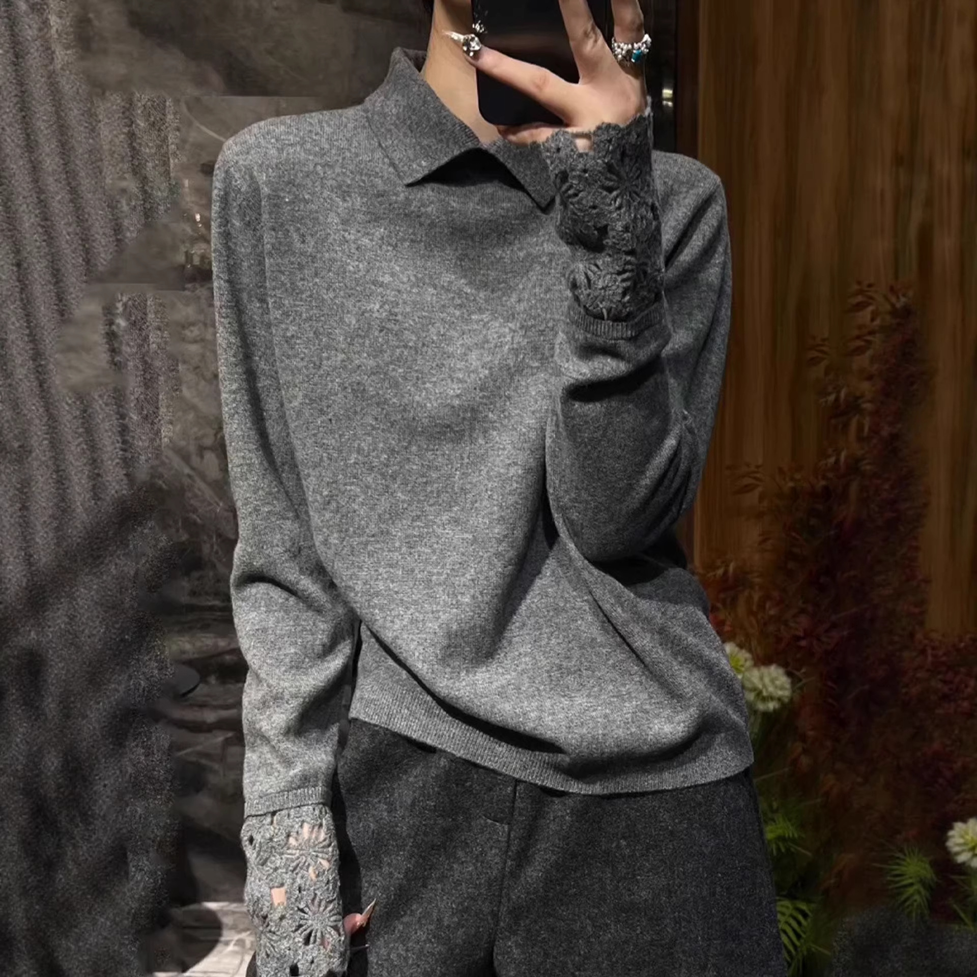 灰色翻领复古钩花袖口设计针织衫女2025秋冬新款简约百搭大码上衣