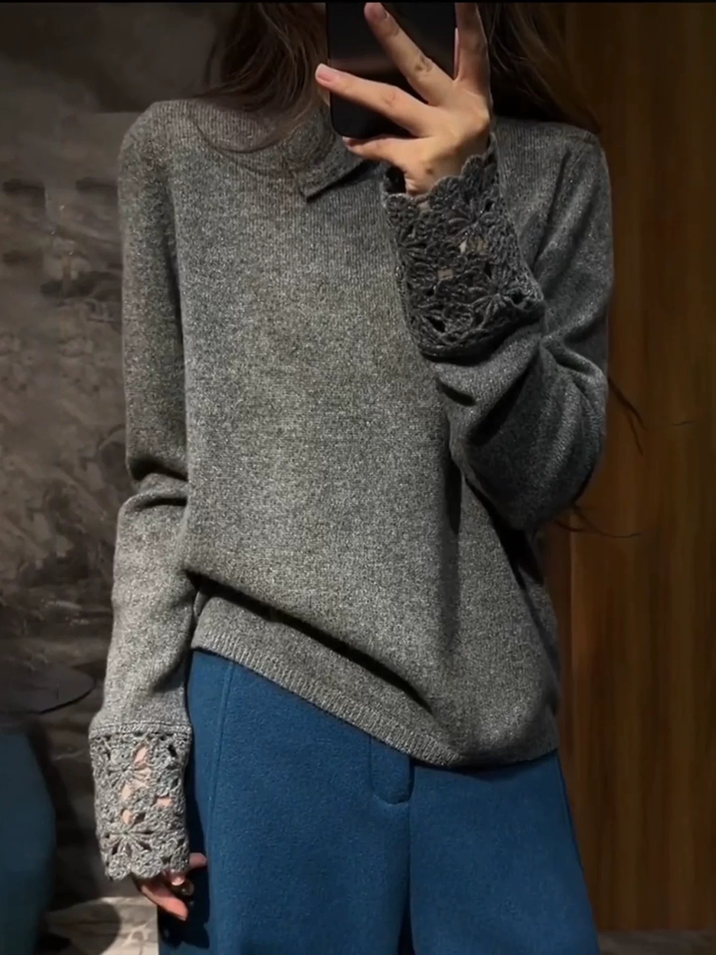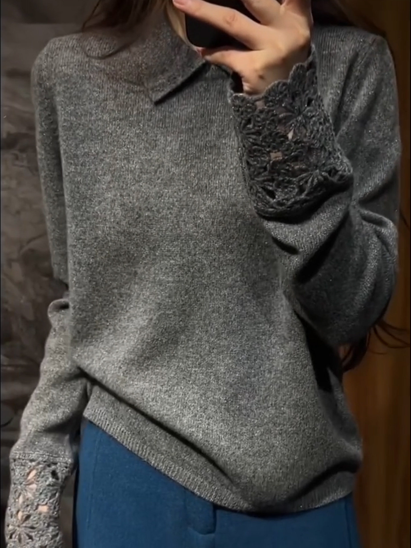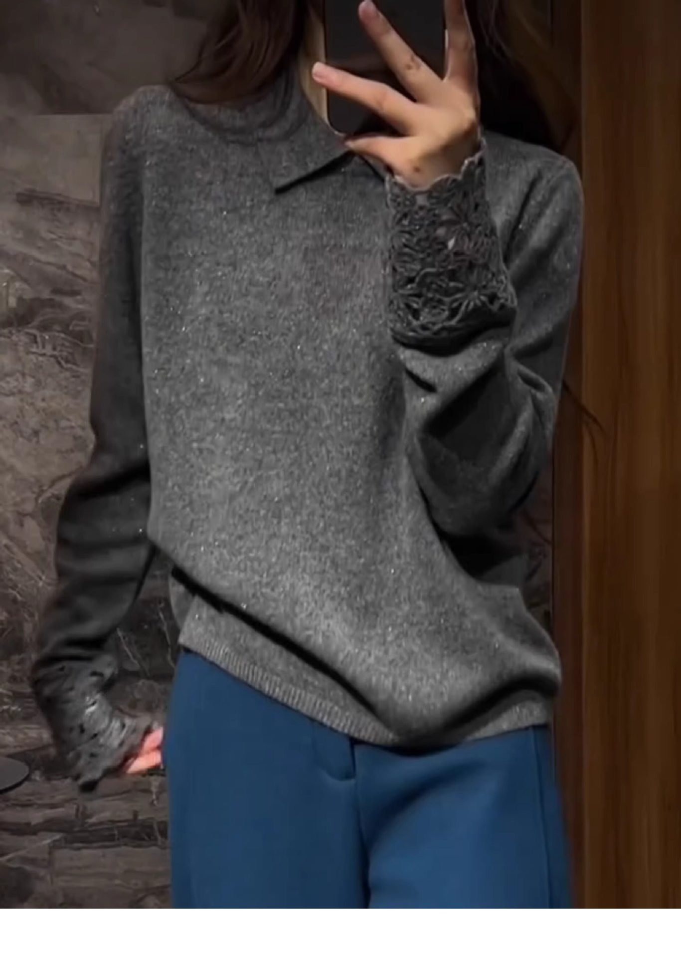 灰色翻领复古钩花袖口设计针织衫女2025秋冬新款简约百搭大码上衣