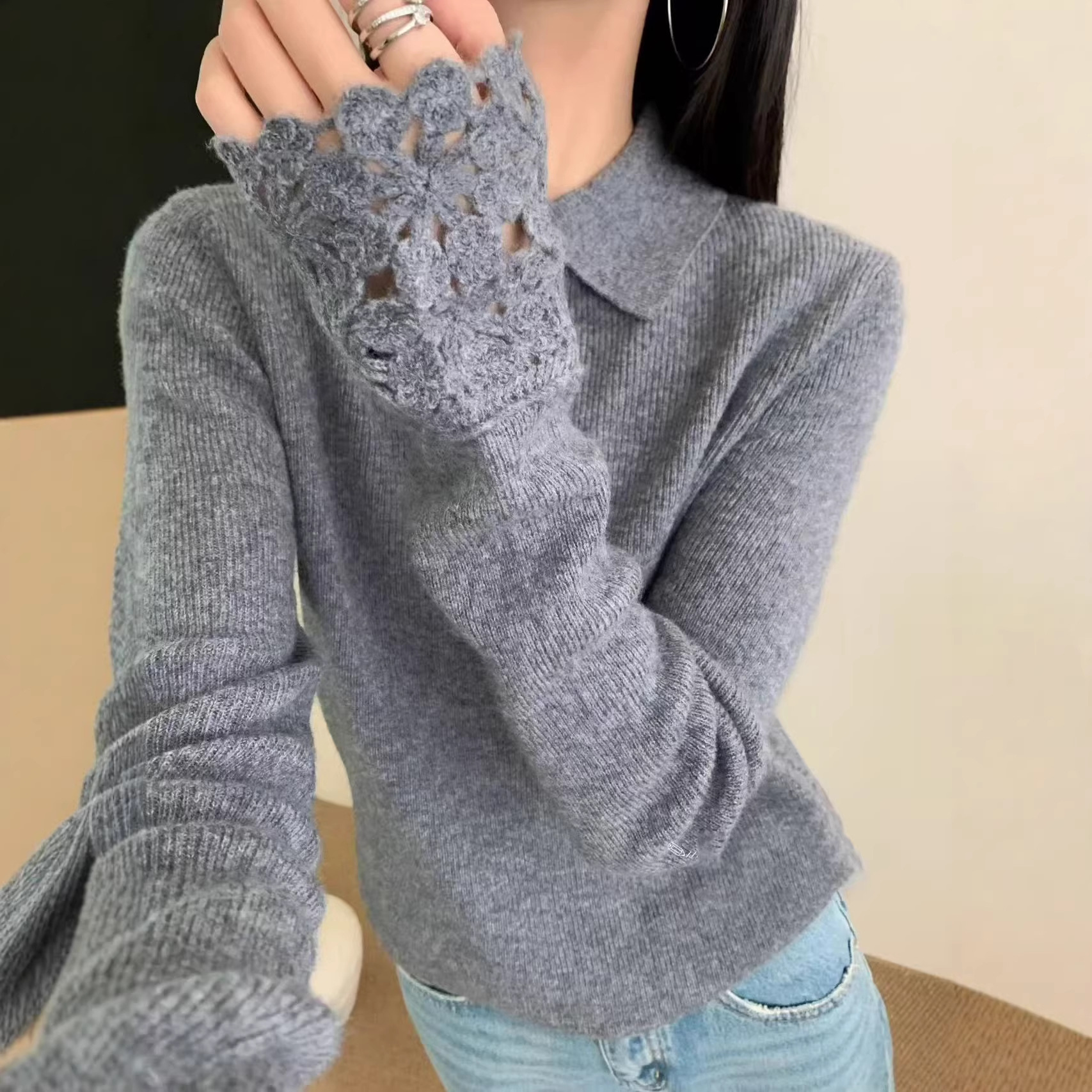 温柔风翻领镂空钩花针织衫女秋冬季新款显瘦百搭长袖简约穿搭上衣