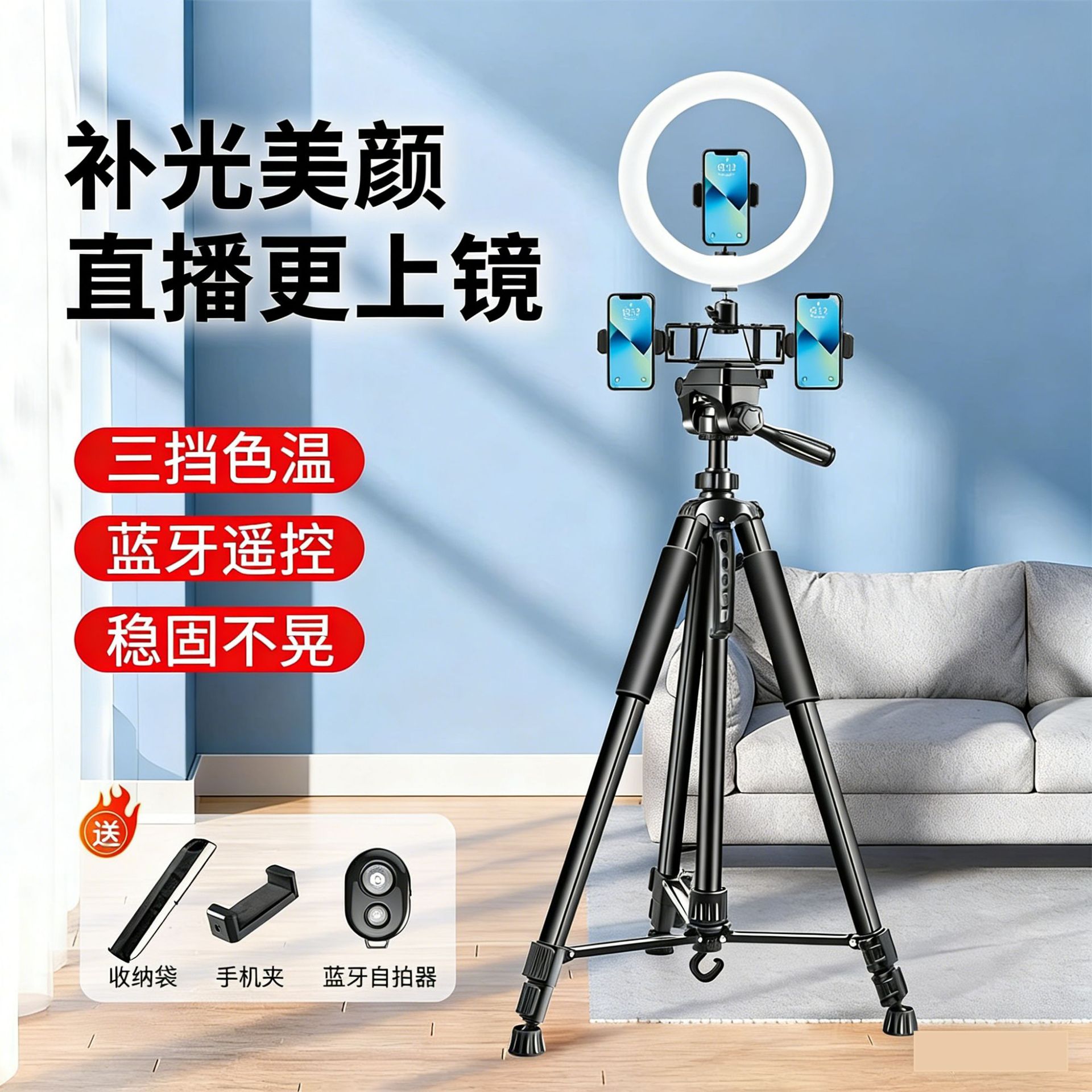 直播专用手机支架带补光灯落地式三脚架2025新款360度旋转双机位