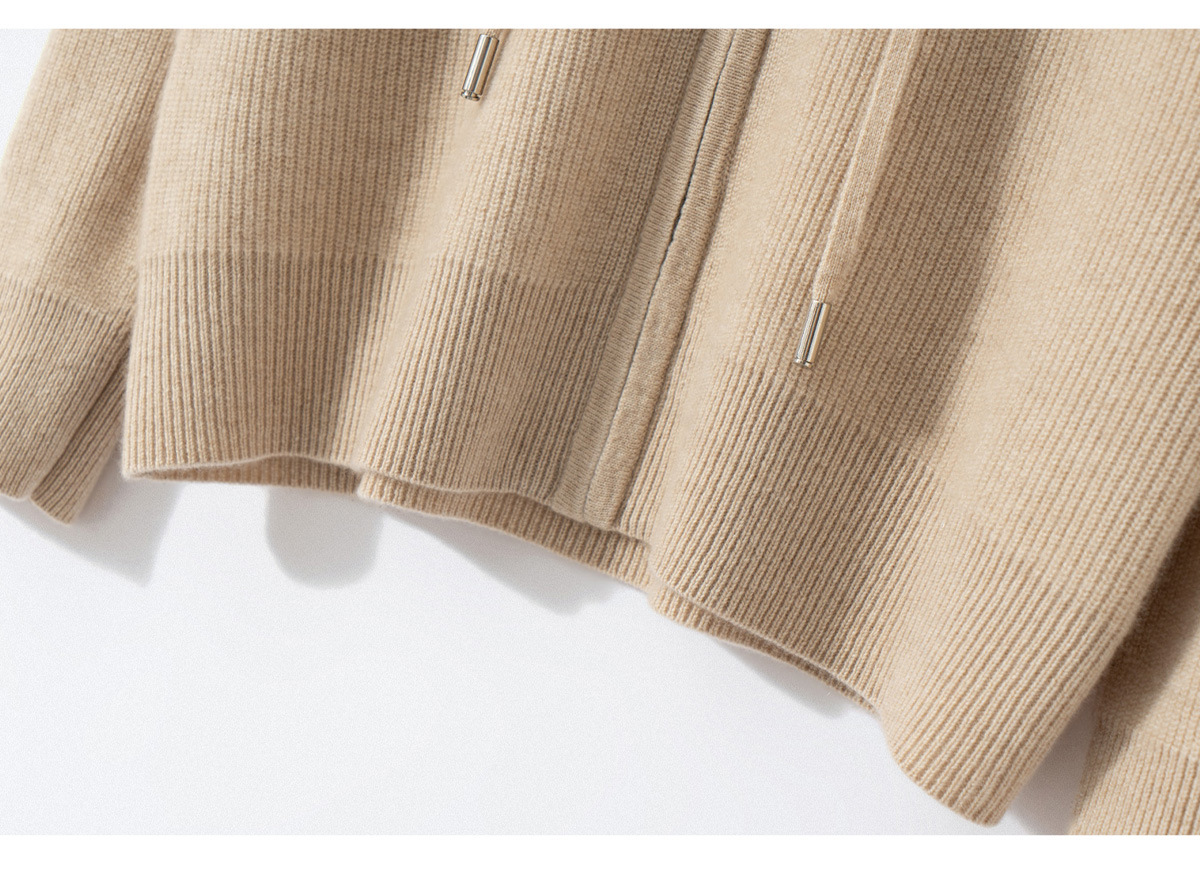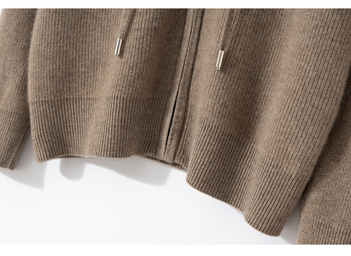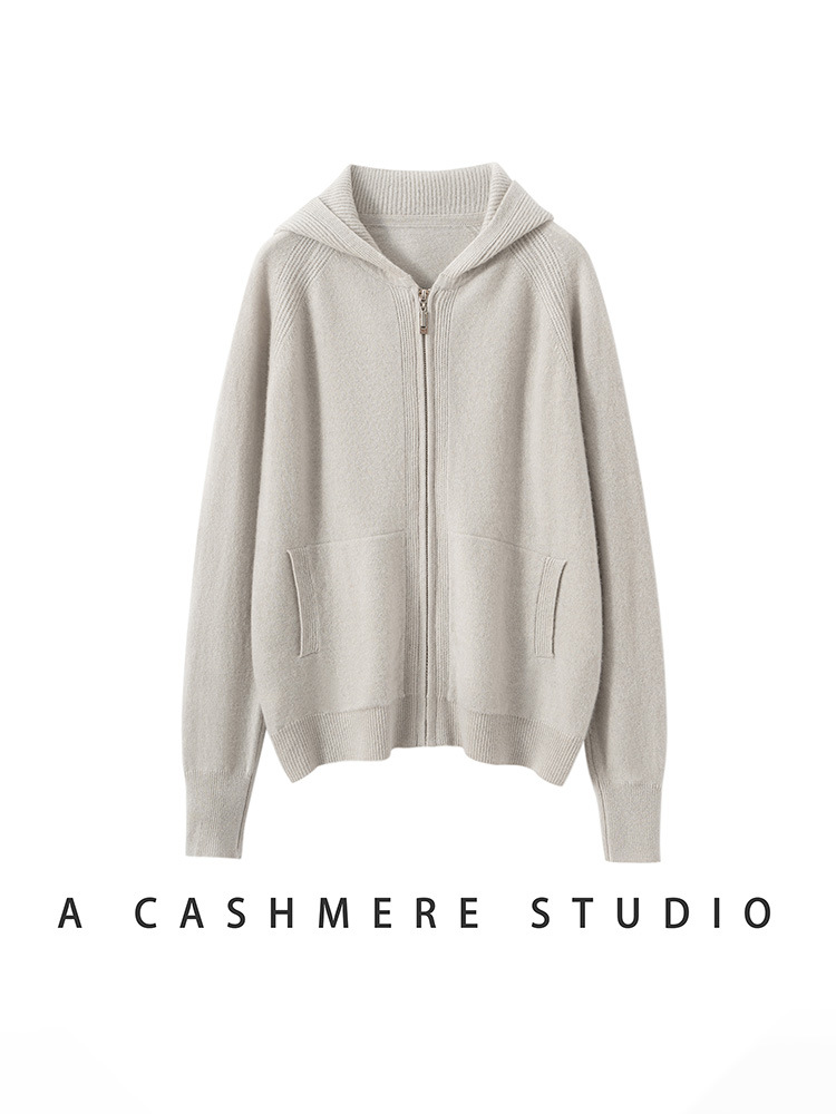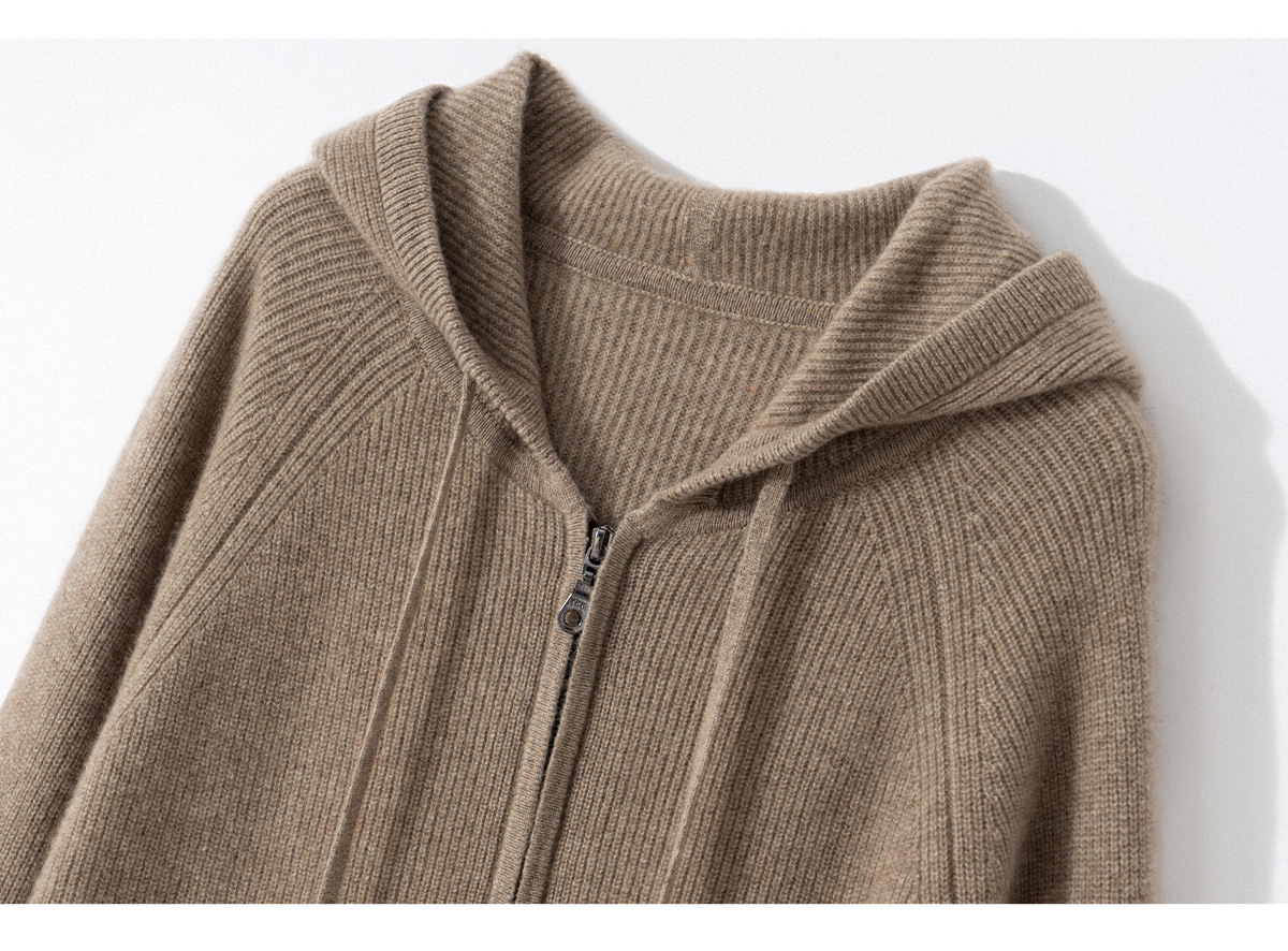100纯山羊绒针织开衫连帽拉链简约加厚毛衣外套帽衫落肩袖羊绒衫
