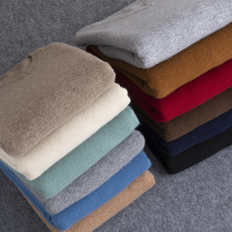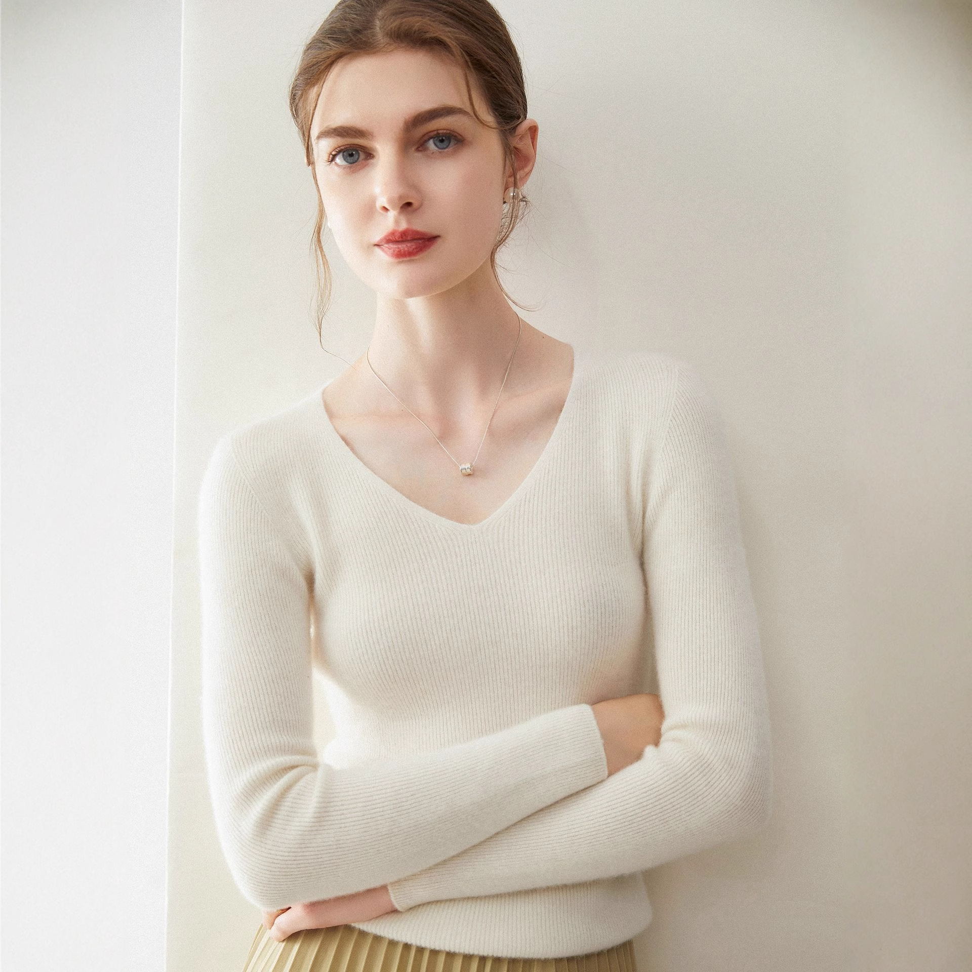100%纯山羊绒衫女一线成衣V领修身显瘦套头毛衣抽条长袖针织打底