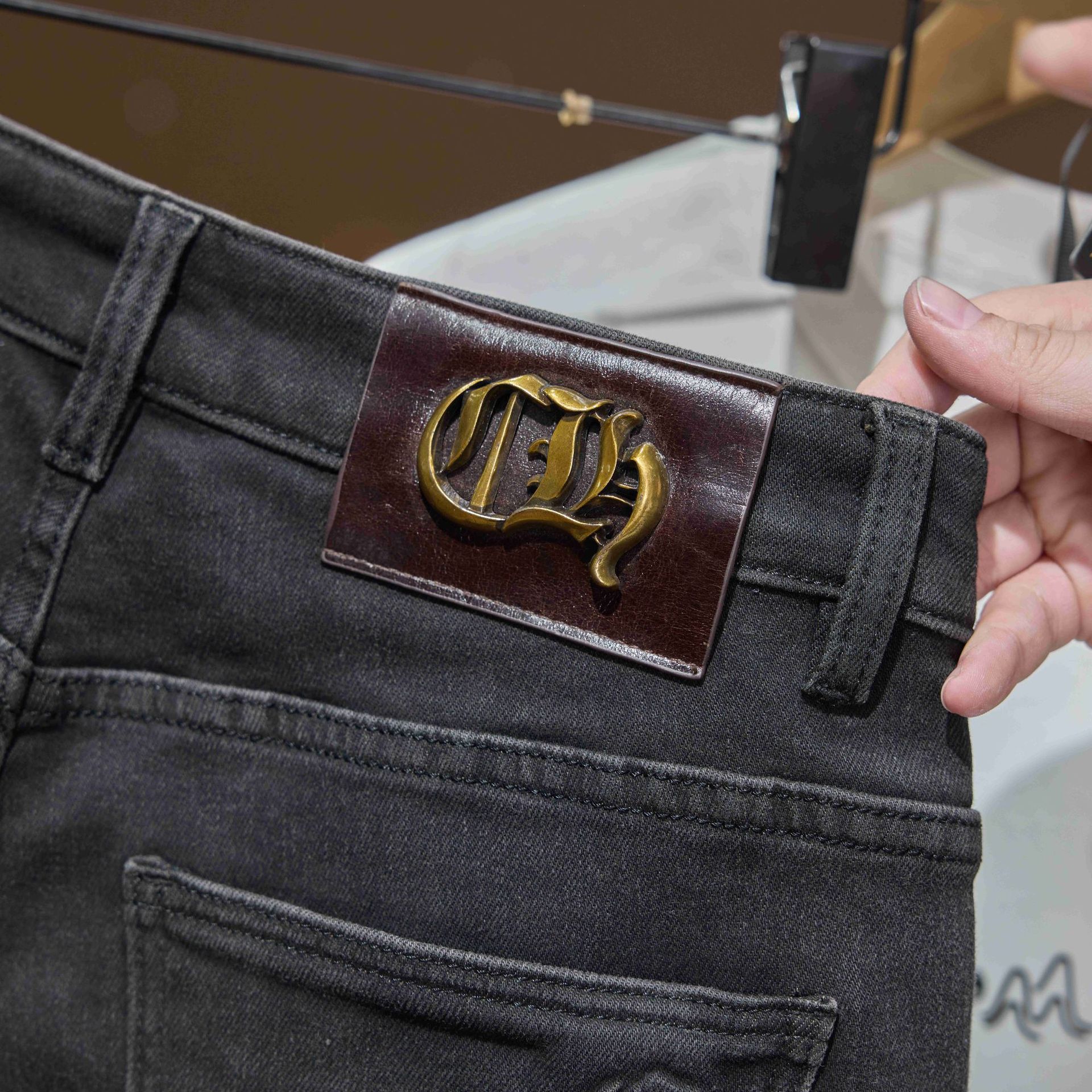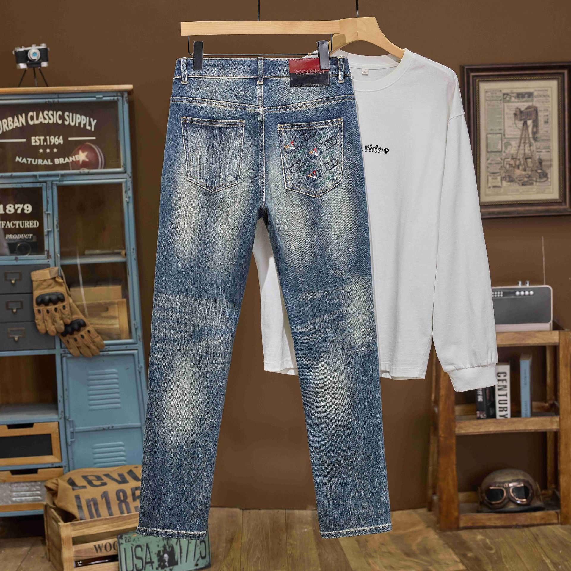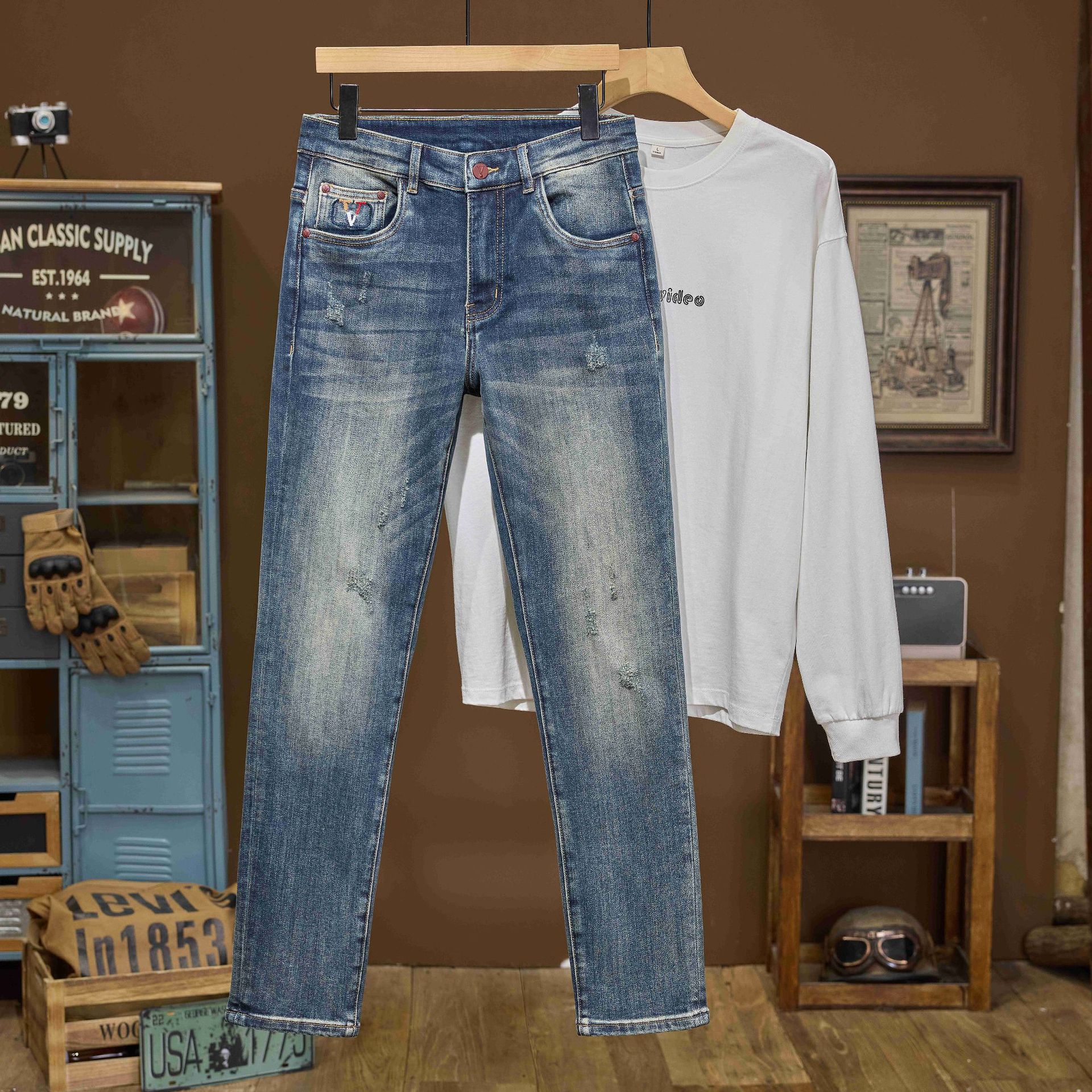 香港のトレンドブランド、高級プリントデニムパンツ、メンズ春秋新作、若者向けファッショナブルでスタイリッシュなトレンド、スリムフィットの細身ロングパンツ