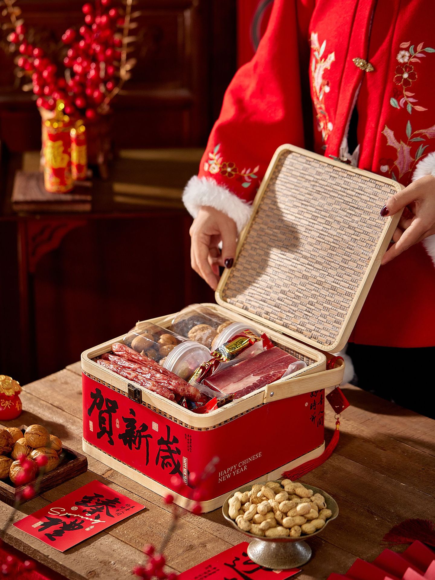 2026马年春节年货竹编竹篮礼盒特产腊肠农产品红色喜庆高档包装盒