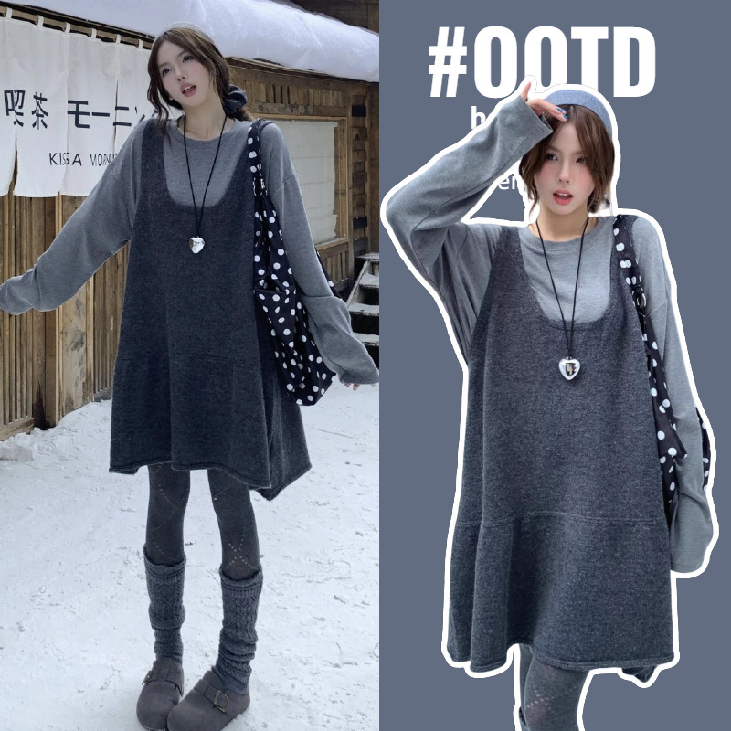孕妇装甜美风套装宽松灰色长袖T恤女秋季叠穿背心连衣裙两件套
