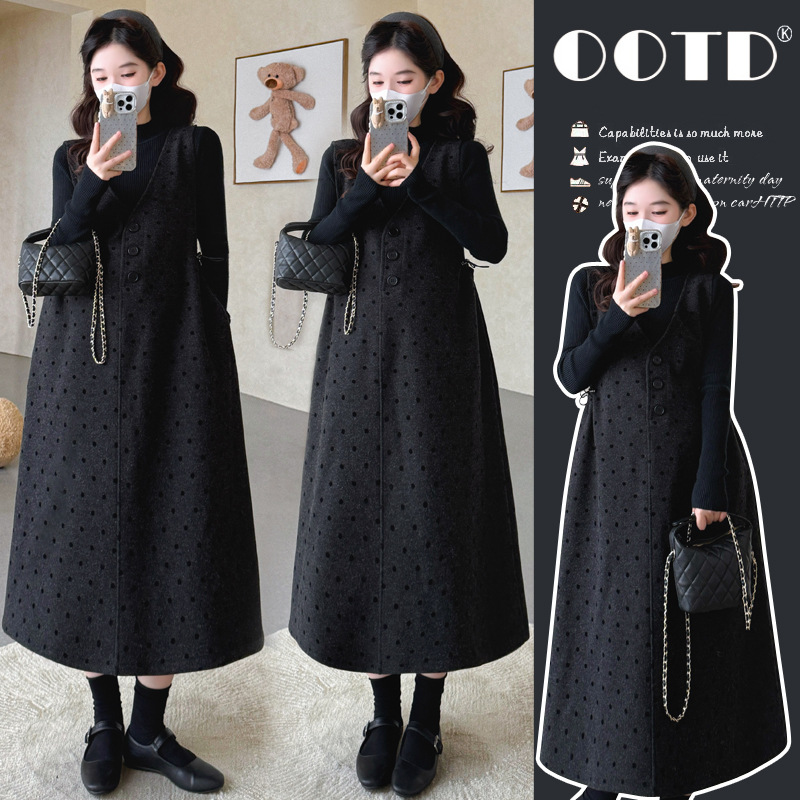 实拍有货~2025秋冬新款套装孕妈高级感穿搭毛呢波点背心裙