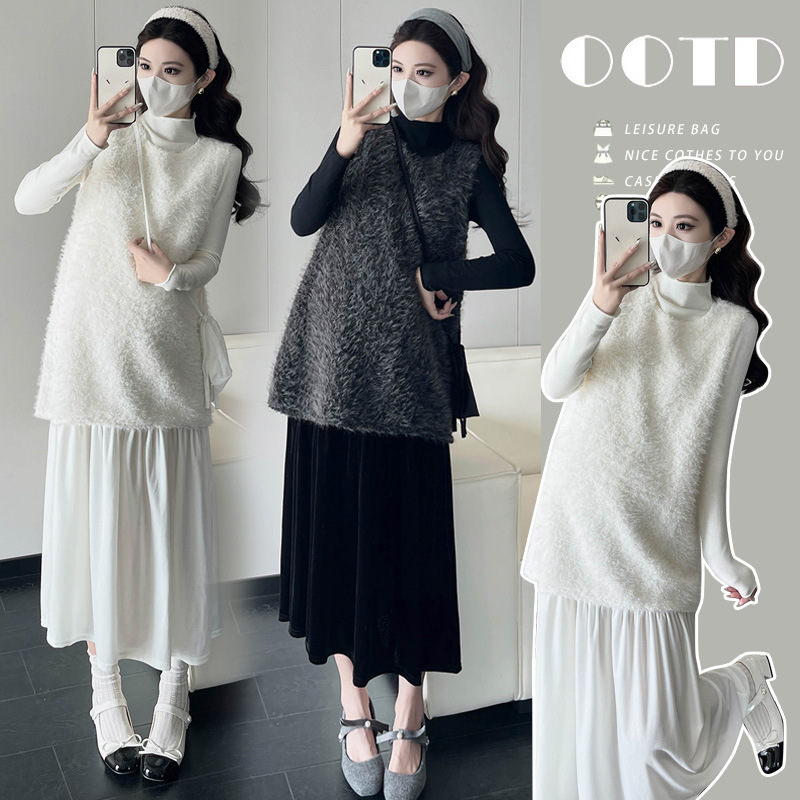 实拍有货 2025孕妇秋冬新款打底衫+拼接丝绒背心裙减龄显瘦两件套