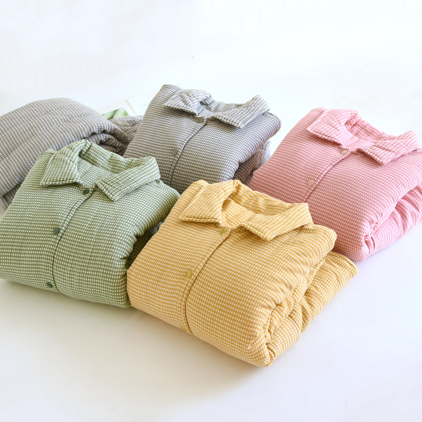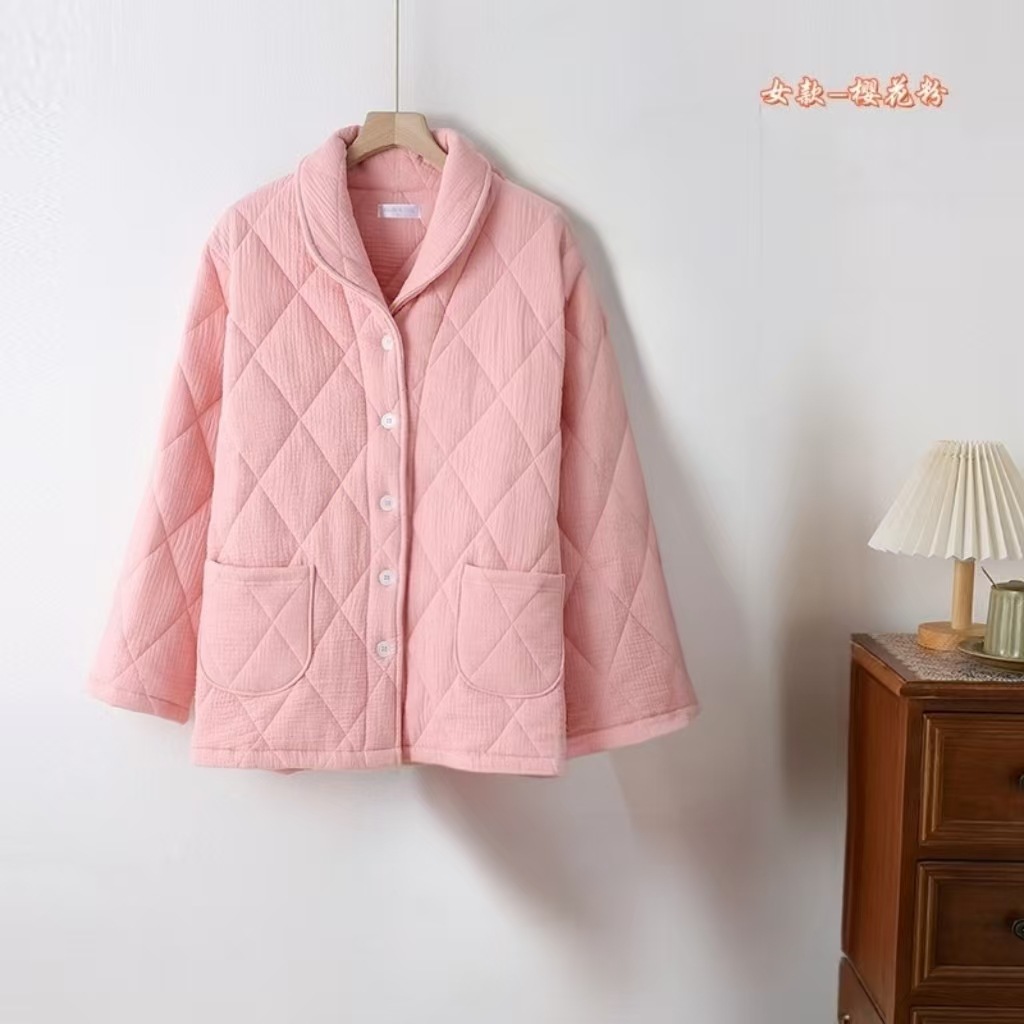 六层加厚绉纹纱布青果领开衫纽扣套装