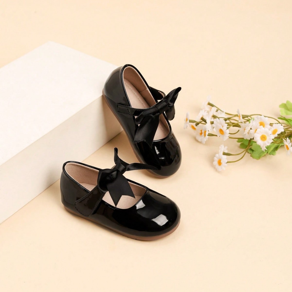 女の子用シングルシューズ、蝶結び付き漆皮パフォーマンスフラットシューズ、小革靴